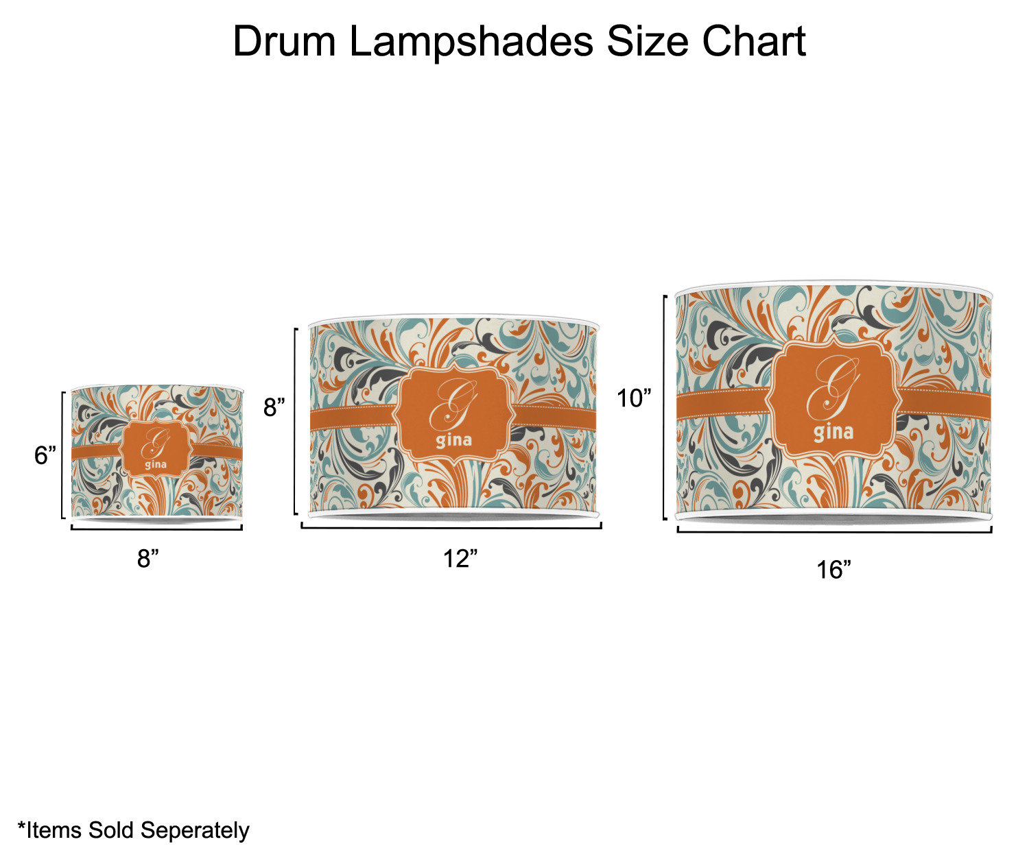 Our customized lamp shades also come in 3 different sizes: 8", 12" and 16", measuring at 8" in diameter by 6" tall, 12" in diameter by 8" tall, and 16" in diameter by 10" tall, respectively.
