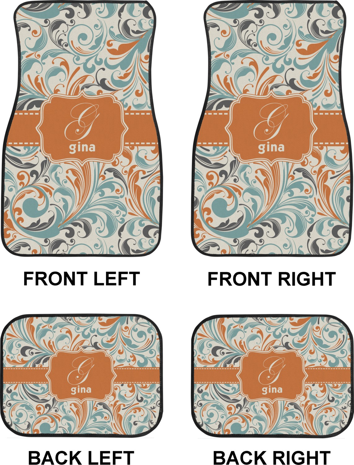 We craft our auto floor mats mats from polyester, apply a black finish to the edges, and lined at the bottom to prevent slippage. These mats protect your floors from grass, mud, and any accidental spills. We display your personalized design on the front face of each mat. The sizes of these car floor liners are standardized to provide a versatile fit for all vehicles. The front rows car mats measure at 17 by 26.5 inches, while the back rows measure at 17 by 13 inches. We sell three packages of car floor mats. You can purchase a pair of front row car mats, a pair of back row car mats, or a set of front row and back row car mats. To make an informed purchase, we recommend measuring the surface area of your car floors.