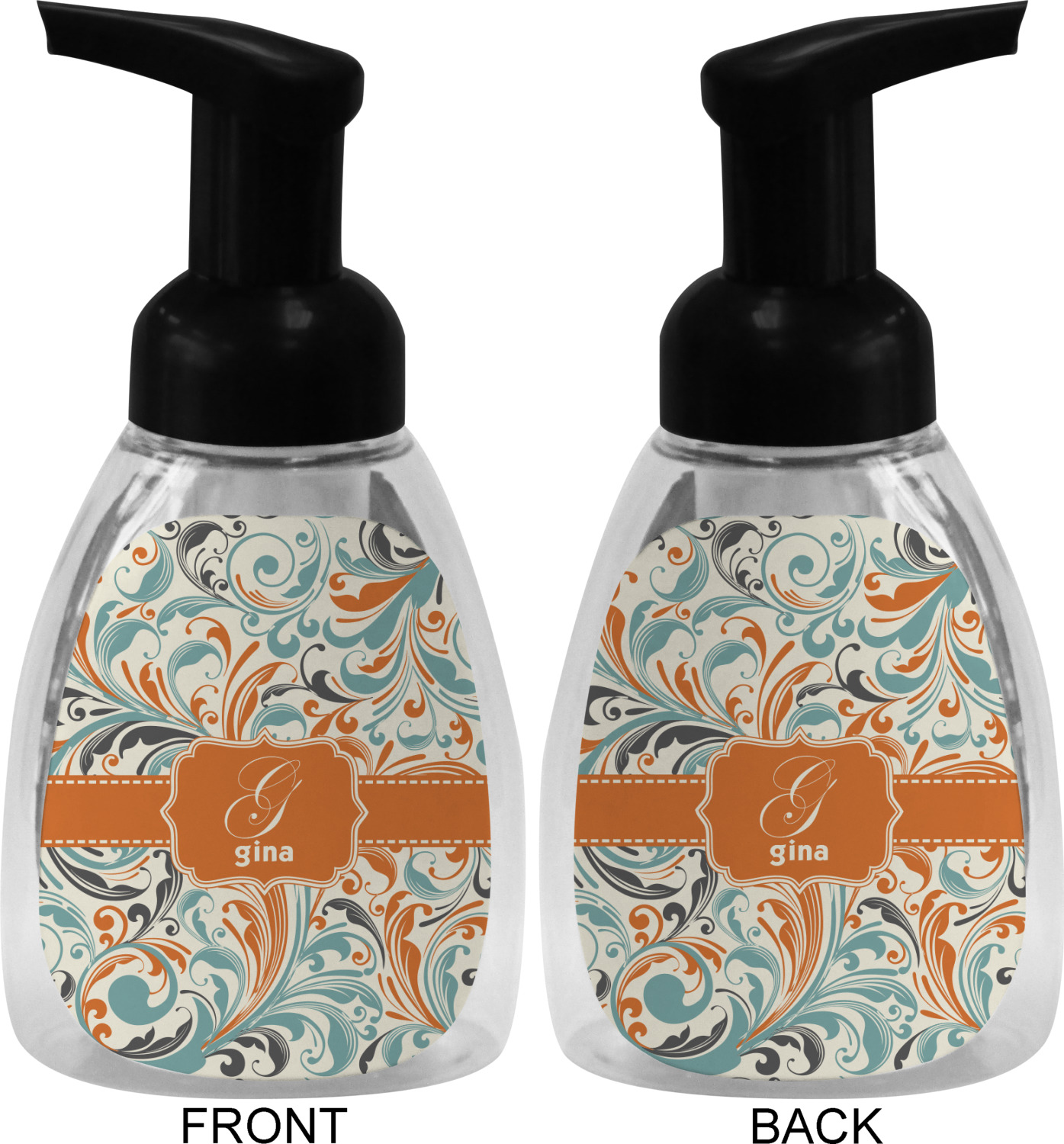 This soap dispenser is made of a robust plastic and has a clear base. The included soap pump is available in black or white color. This dispenser is 6.5 inches tall, 3 inches wide, and 2 inches deep. We display your customized designs on the front and back sides of these foaming hand soap dispensers.