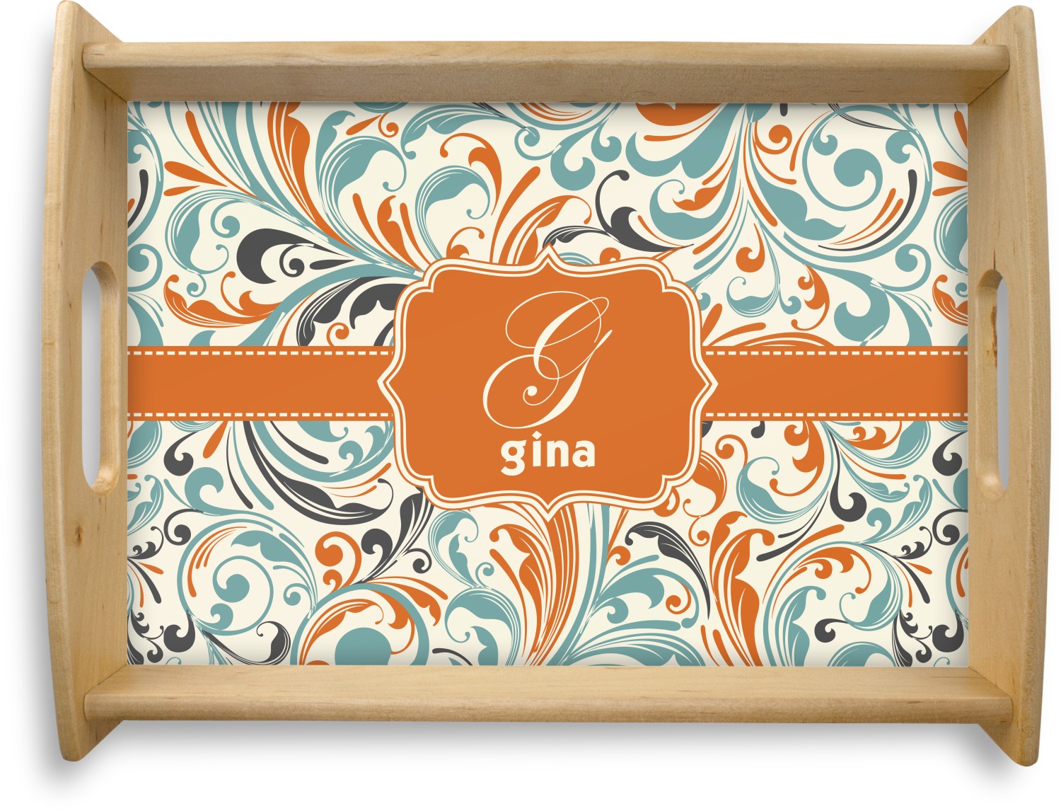 This serving tray with handles features square edges and two rounded sides, creating a very modern look. Each side is fabricated from a beautifully cut, natural wood. The bottom of the interior of the tray displays your customized design in bright, vibrant color. The tray is sold in both a black color and a natural wood look. Each variation of the wood serving tray has two sizes: Small, which is 14" x 10" x 2.25", and Large, which is 19.5" x 13.5" x 2.75".