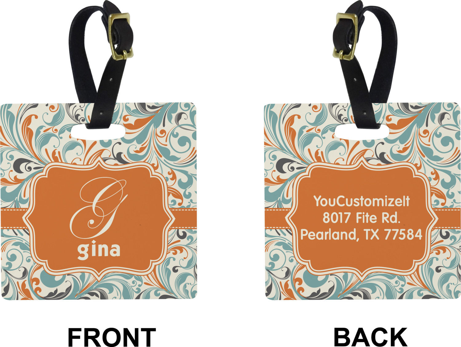 These personalized bag tags are sold in a variety of shapes, so that you may find the product that meets your vision exactly. We sell a round luggage tag, which measures at approximately 4" x 4". Our square luggage tag is about 3.5" x 3.5", while our rectangular version is 2.75" x 4 ".