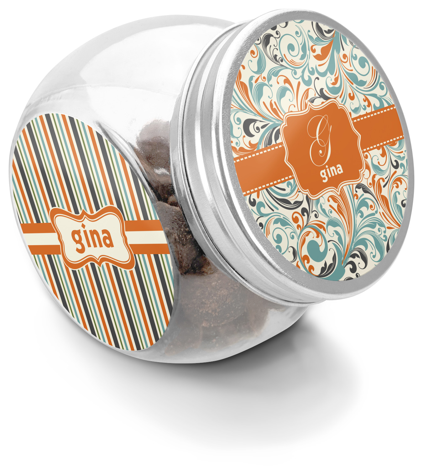 This treat jar is an excellent way to store treats for your favorite canine or feline. Moreover, their delicate, classy appearance makes them a tasteful addition to your countertop's décor. Crafted from clear glass, its unique construction and silver metal, screw-on lid allows for quick and easy access. Three, permanent, vinyl stickers are applied to both sides of the jar and lid, presenting your personalized design. The base of this glass, dog treat jar is 3.4" x 4.75", and the jar stands at 5" tall. Though on the smaller side, this jar is best suited for smaller treats or training treats.