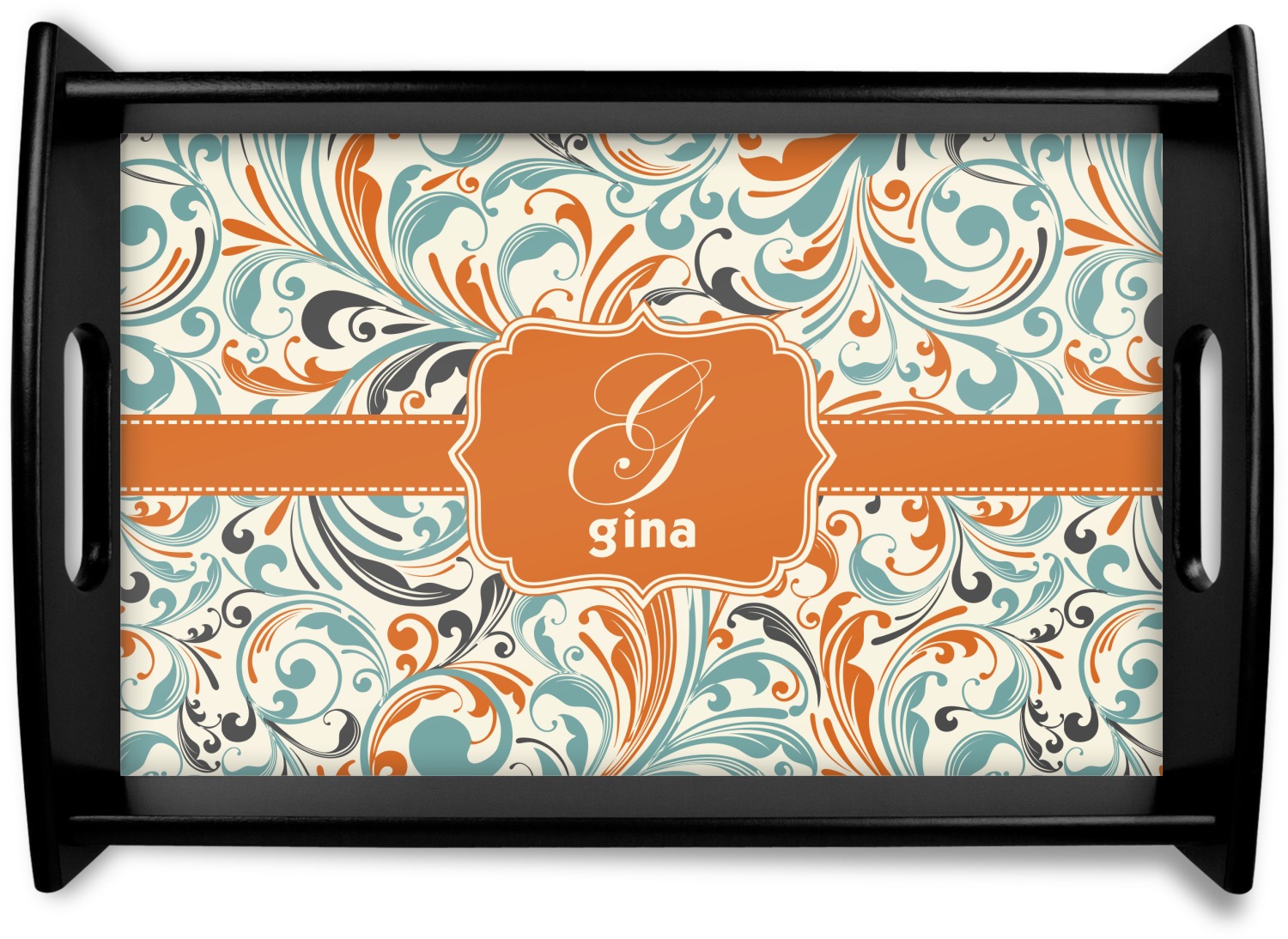 This serving tray with handles features square edges and two rounded sides, creating a very modern look. Each side is fabricated from a beautifully cut, natural wood. The bottom of the interior of the tray displays your customized design in bright, vibrant color. The tray is sold in both a black color and a natural wood look. Each variation of the wood serving tray has two sizes: Small, which is 14" x 10" x 2.25", and Large, which is 19.5" x 13.5" x 2.75".