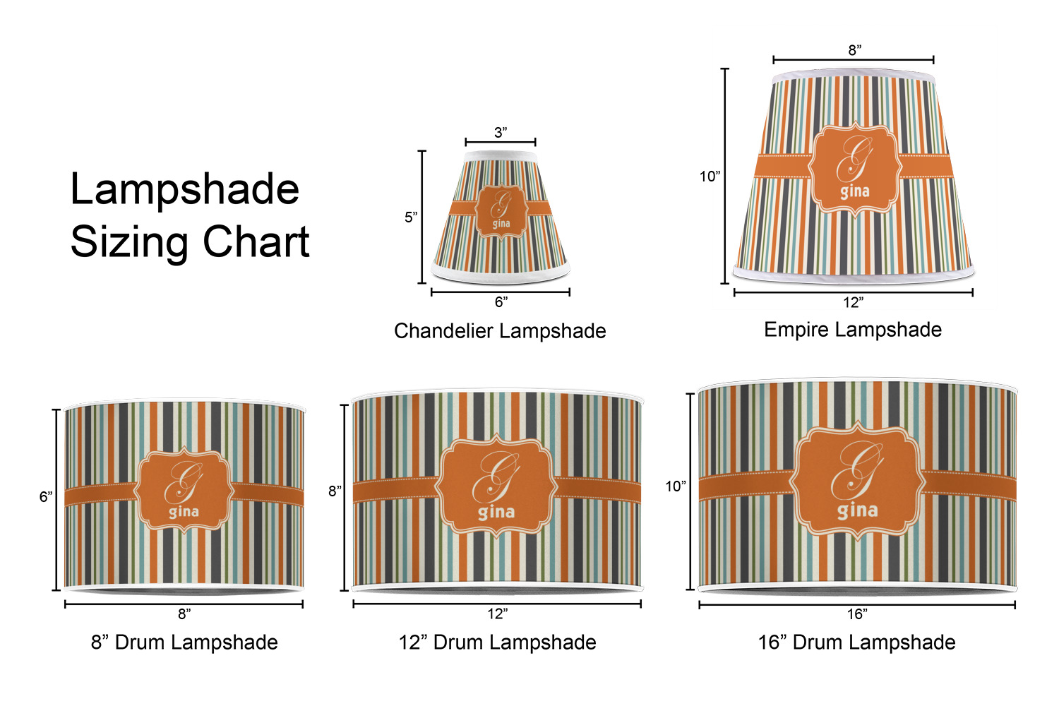 Our customized lamp shades also come in 3 different sizes: 8", 12" and 16", measuring at 8" in diameter by 6" tall, 12" in diameter by 8" tall, and 16" in diameter by 10" tall, respectively.