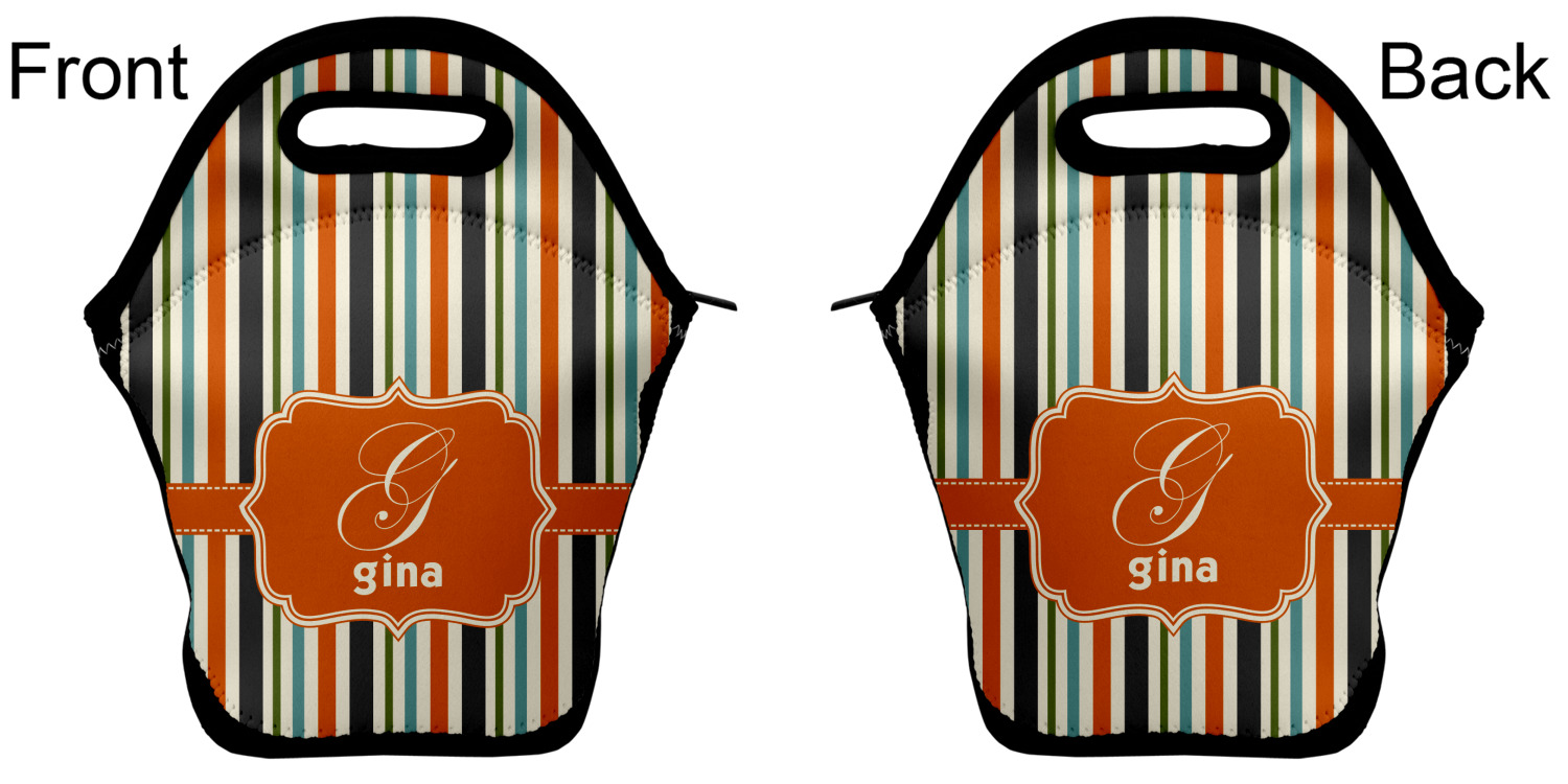 Our personalized lunch bags are made from a strong neoprene, and secure with a zipper closure that lines the top of the bag.The edges of the neoprene are sewn together with a heavy duty stitch, adding to the durability of the bag. The is accompanied by a reinforced handle at its top, for the easy transport of your lunch. We display your personalization across both the front and back of this neoprene lunch bag, while the remaining sides are a sleek black in color. Each bag measures at 13.5 inches tall, and 11.5 inches wide.