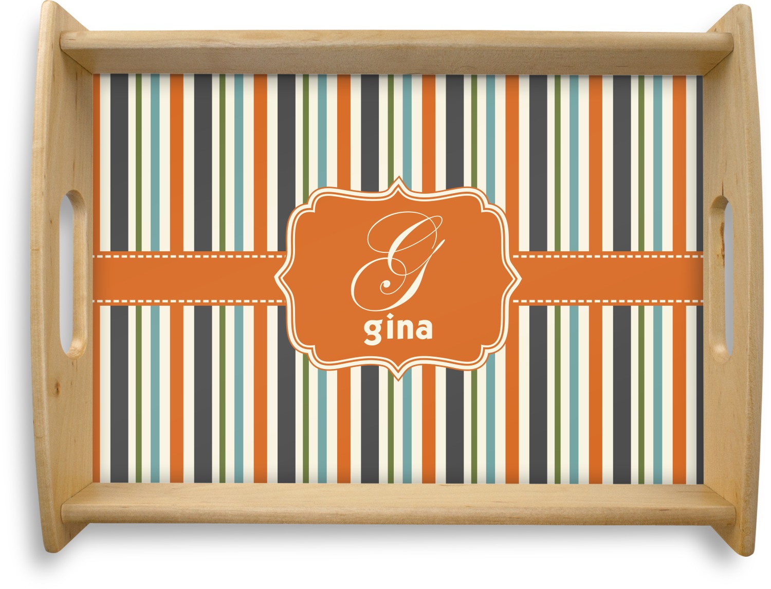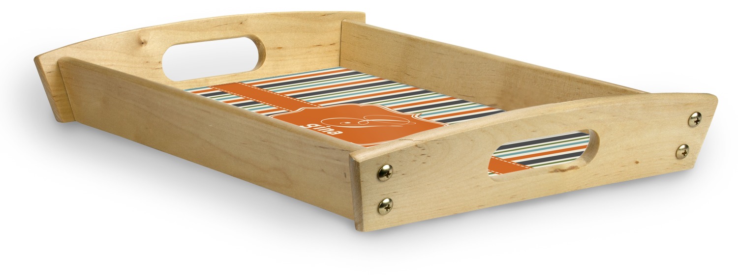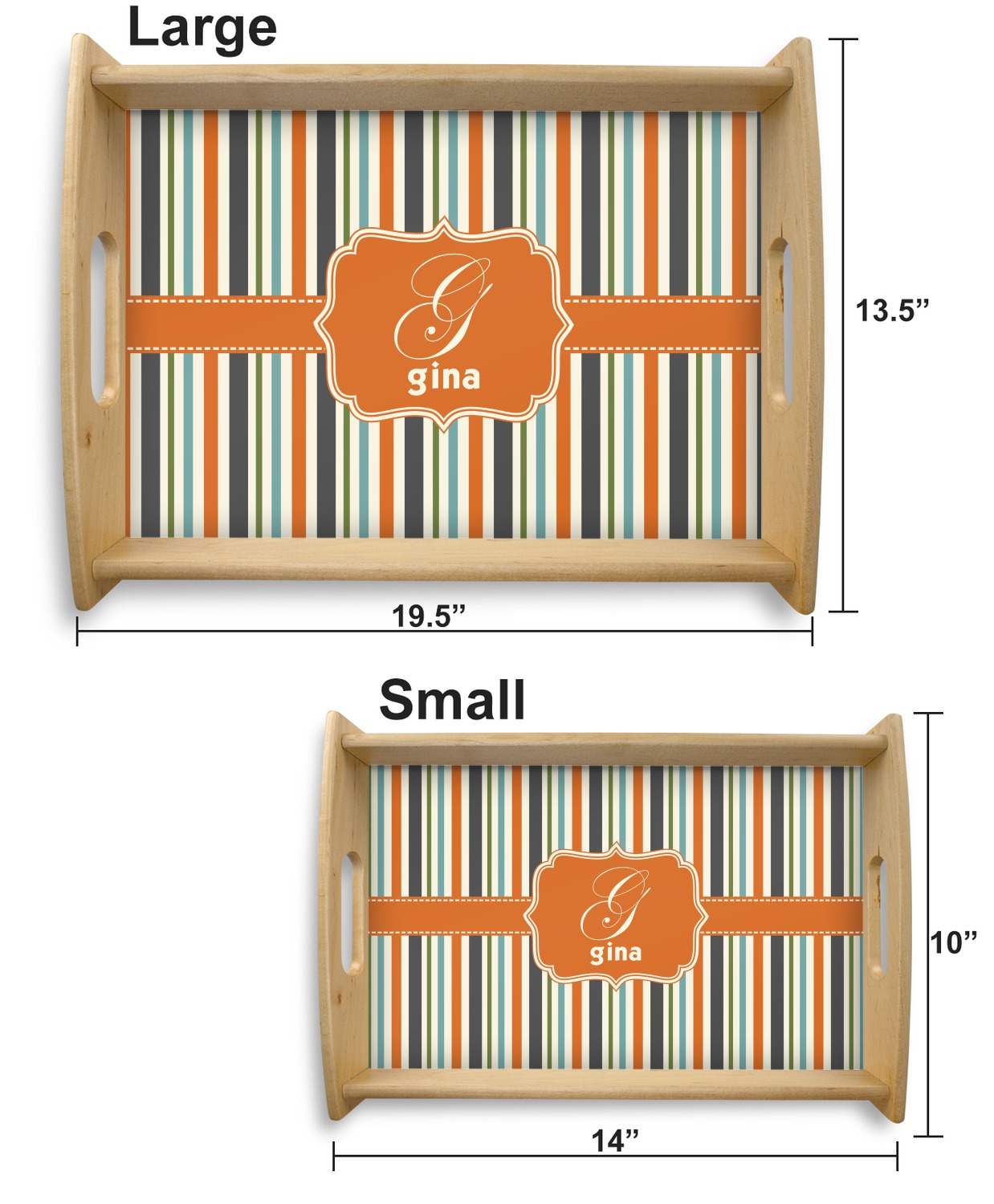 This serving tray with handles features square edges and two rounded sides, creating a very modern look. Each side is fabricated from a beautifully cut, natural wood. The bottom of the interior of the tray displays your customized design in bright, vibrant color. The tray is sold in both a black color and a natural wood look. Each variation of the wood serving tray has two sizes: Small, which is 14" x 10" x 2.25", and Large, which is 19.5" x 13.5" x 2.75".