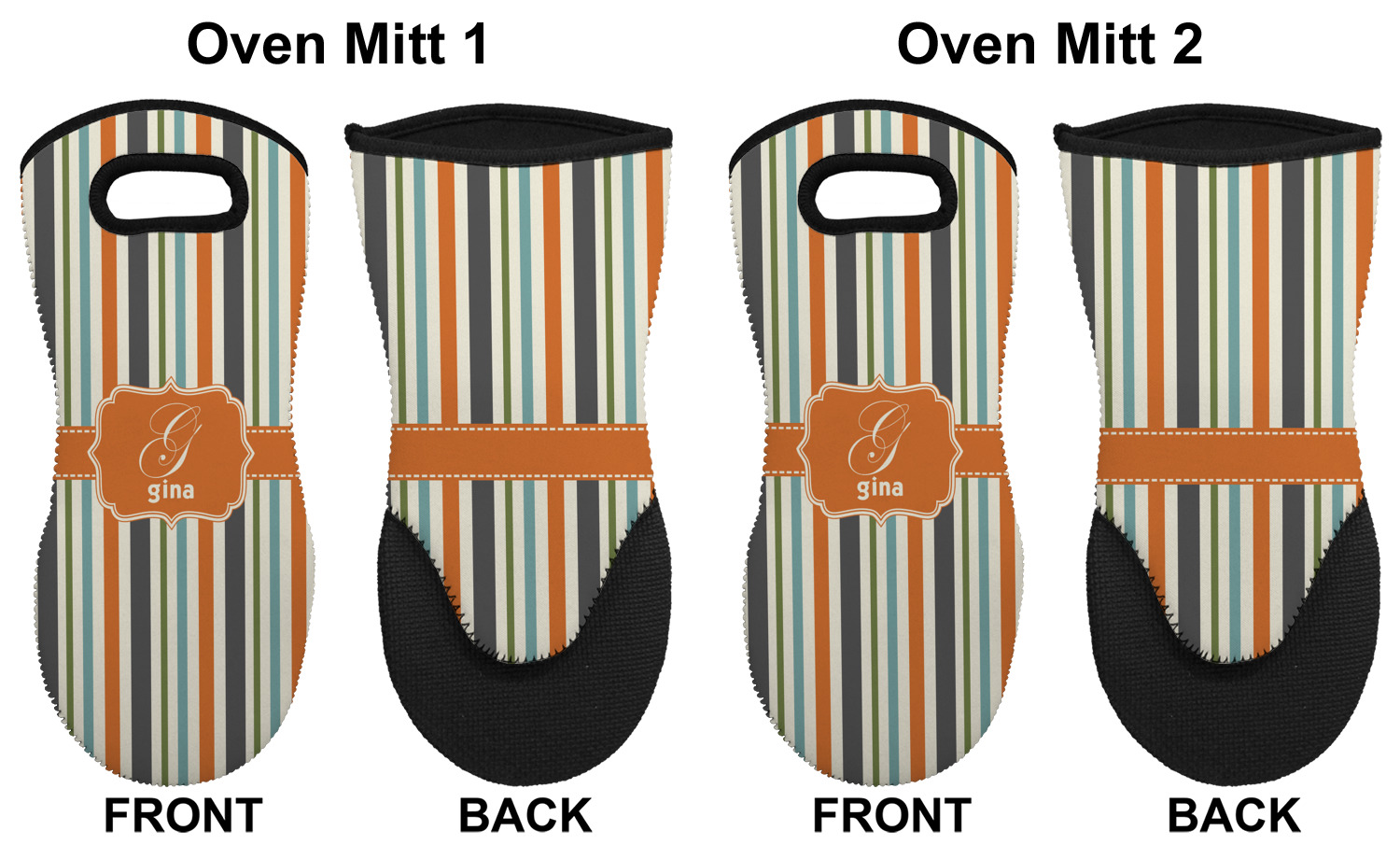 These heat resistant gloves are made entirely of a durable neoprene; the front features a softer texture, while the palm's side has a textured surface, meant to handle heat up to 500 degrees Fahrenheit. Thick, heavy duty stitching connects the two sides. A small, oval cutout appears on the front, and can be used to hang and store the mitt. Your personalization appears on the front, and the upper part of the back of the mitt. The style of these oven mitts are suitable for both the right and left hand, depending on your needs. If you need one for each hand, be sure to order two!