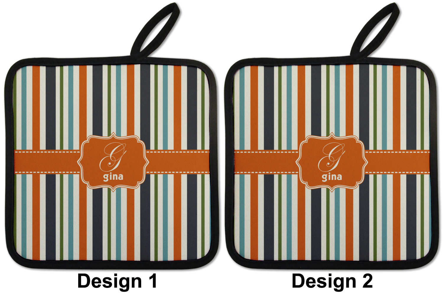 Our personalized pot holders feature a neoprene front that displays your personalization in vibrant colors. The backing of the hot pot holder is rubberized; the textured backing allows you to have a great grip when using this custom pot holder. The two materials are joined with a sleek, black trim, and the holder also includes an attached loop for hanging and storage. The pot holder is approximately 8.75 inches by 8.75 inches and 0.25 inches tall, while the fabric loop is 2.5 inches long. You can purchase a kitchen pot holder by itself or as a set of 2. We also offer a set including one pot holder and one oven mitt.