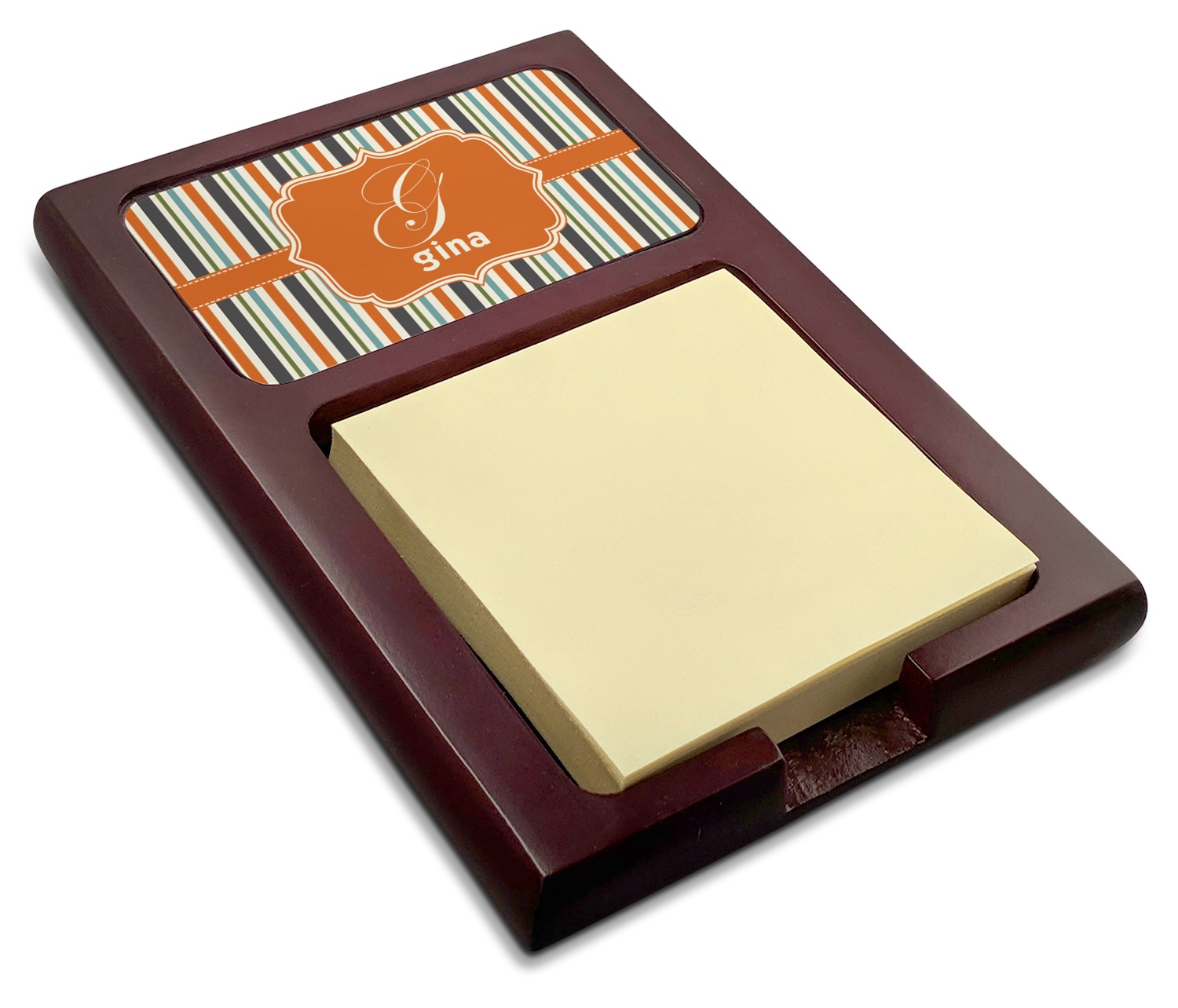 Crafted from a fine mahogany, this post it note holder is in the shade of a dark, cherry color. The dispenser itself is about 4.25 by 6.25 by 0.75 inches. You can place your 3 by 3 inch sticky notes in the indentation below the nameplate. We print your customization onto the nameplate that rests above the velvety indentation.