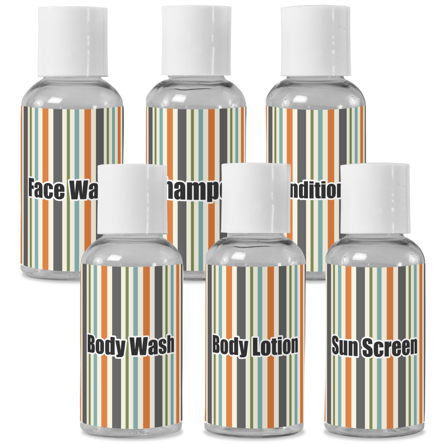 These soap and lotion travel bottles are the perfect place to start. Each set comes with 6 clear plastic bottles with white pop top lids. The bottles are cylindrical and can hold approximately 2.7oz. Perfect for plane travel!