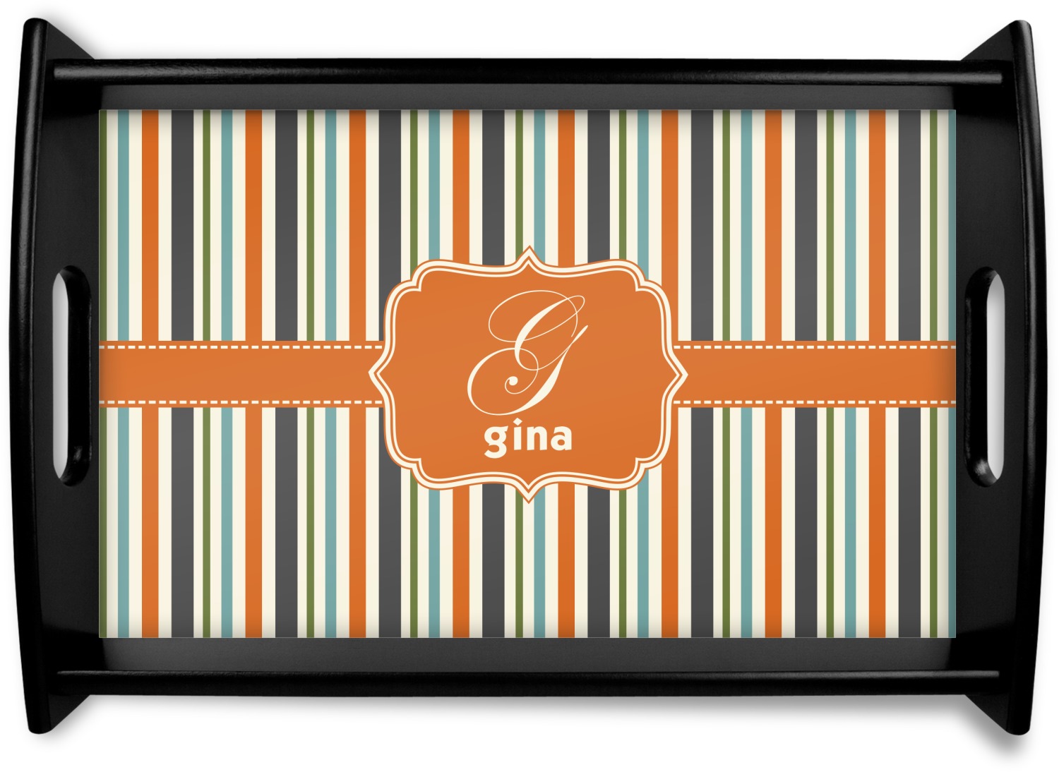 This serving tray with handles features square edges and two rounded sides, creating a very modern look. Each side is fabricated from a beautifully cut, natural wood. The bottom of the interior of the tray displays your customized design in bright, vibrant color. The tray is sold in both a black color and a natural wood look. Each variation of the wood serving tray has two sizes: Small, which is 14" x 10" x 2.25", and Large, which is 19.5" x 13.5" x 2.75".