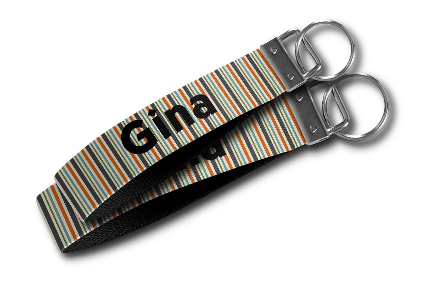 These key fob keychains are made from a polyester weave, right here in the USA. They feature a silver, metal clasp, attached to a round keyring. The piece gives the personalized wristlet a beautiful, finished look. Your customized design is printed on the outside of the keychain strap. We carry these wristlets in two sizes: small, which is 5 inches in width, and large, which is 5.5 inches in width.