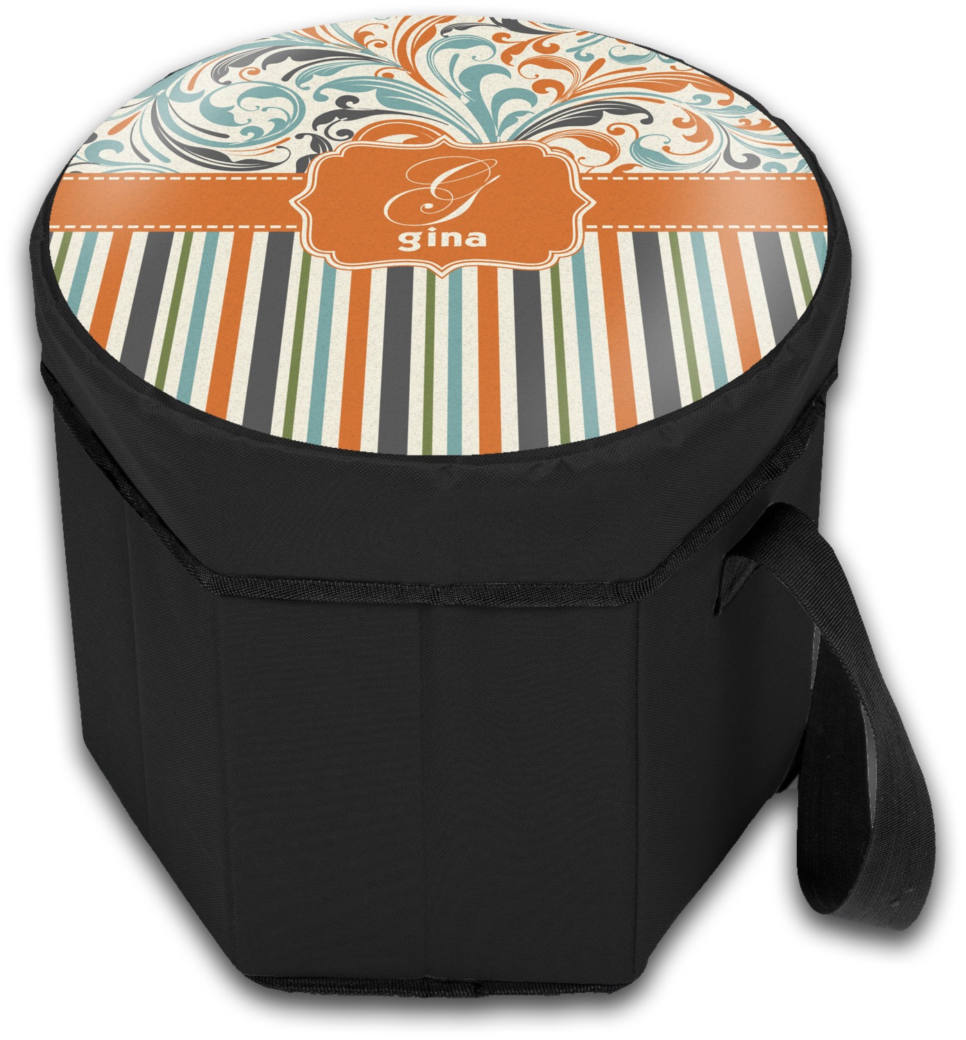 Our collapsible insulated coolers feature a unique six-sided hexagon shape, are lightweight, durable and can be turned into a seat. This cooler is fully insulated with silver foil lining to keep food and drinks hot or cold, and has a 12-quart capacity. Although this cooler collapses for easy transport, hidden inside are composition panels made of sturdy wood that give the frame strength and allow this cooler to be used as a seat. Simply sit down on the personalized cover and give your legs a break! (Maximum weight capacity of 200 pounds.)