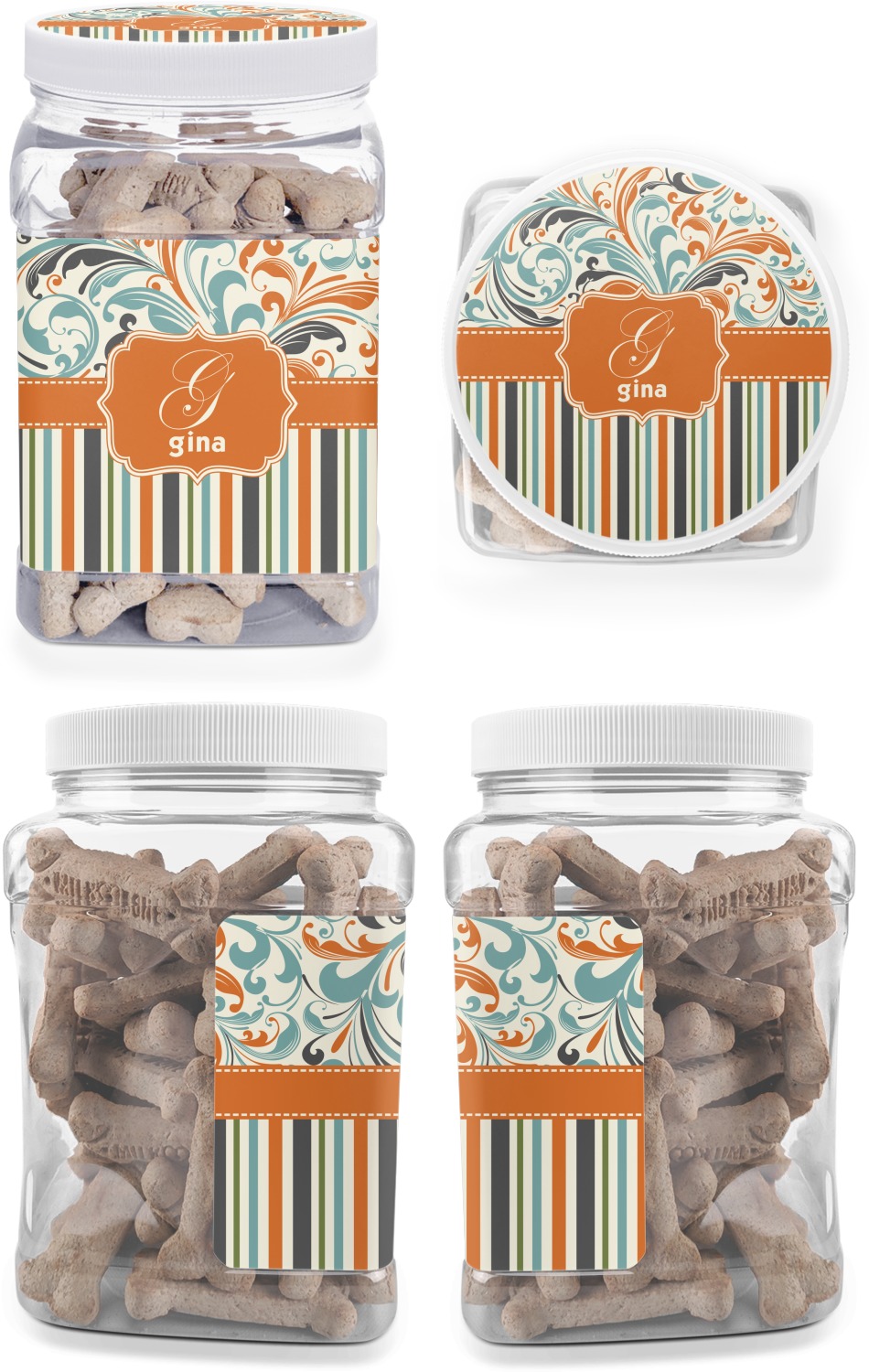 This half gallon jar, made from a sturdy plastic, is the perfect way to keep treats from any naughty pet paws, while still keeping them ready on hand for when your pup performs an impressive trick. This dog cookie jar features a screw-on, white lid that displays your personalized design on a vinyl sticker. We apply another customized sticker that wraps around the front and sides of the jar. Our dog treat jar also has indentations on the rear ends of the sides, which allows for convenient handling, and its square frame allows for easy storage.