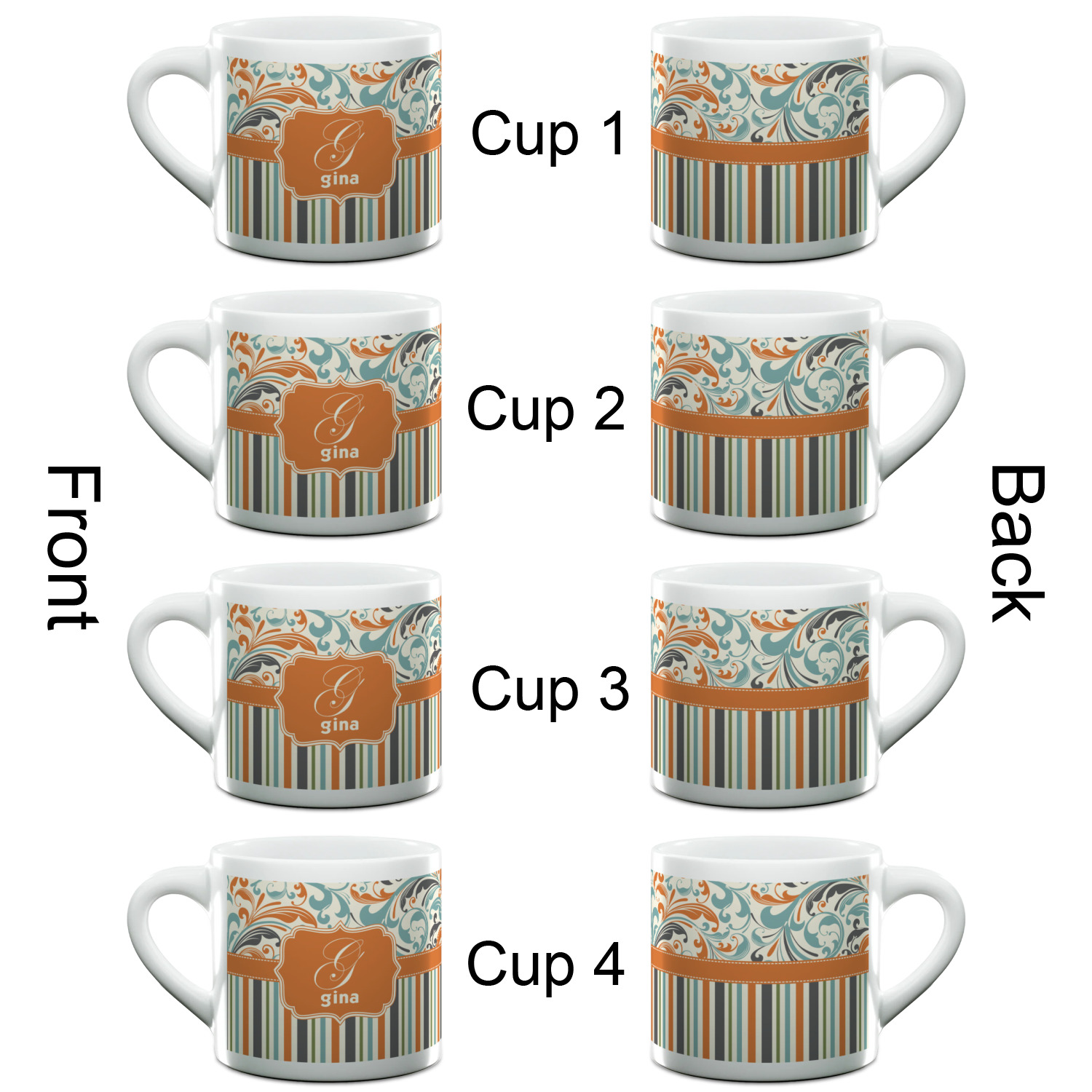 Each of our espresso mugs is a ceramic material sure to keep your drink warm. Personalize one cup for yourself, or order a set of 4! Its the perfect little gift for any coffee lover! We carry two sizes for you to personalize - 3 oz. (approx. 3.25" x 2.325" x 2.625") or 6 oz. (approx. 4" x 2.9" x 2.9"). Our 3 oz. mug is perfect for that single shot espresso while our 6 oz. mug can be your next favorite cappuccino cup holding two shots of espresso!