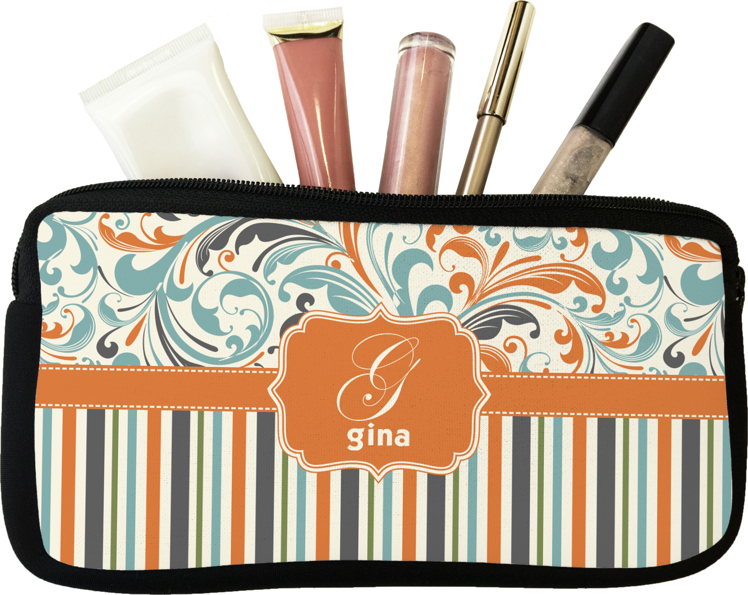 Our personalized makeup bags are available in many different designs, patterns and colors - so you are sure to find one that will love. They are made of neoprene (same material as wet-suits) and thus are water resistant, so spillages in your makeup bag will not end up all over you purse. They are customized on one side and are black on the other side and the zipper is black as well.