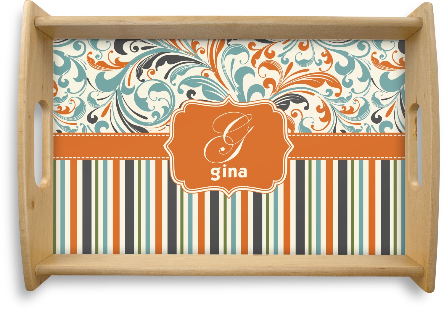 This serving tray with handles features square edges and two rounded sides, creating a very modern look. Each side is fabricated from a beautifully cut, natural wood. The bottom of the interior of the tray displays your customized design in bright, vibrant color. The tray is sold in both a black color and a natural wood look. Each variation of the wood serving tray has two sizes: Small, which is 14" x 10" x 2.25", and Large, which is 19.5" x 13.5" x 2.75".
