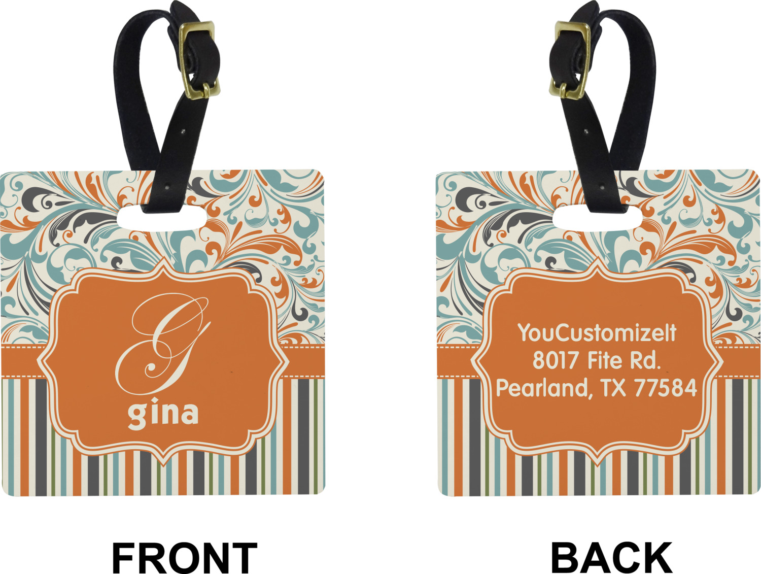 These personalized bag tags are sold in a variety of shapes, so that you may find the product that meets your vision exactly. We sell a round luggage tag, which measures at approximately 4" x 4". Our square luggage tag is about 3.5" x 3.5", while our rectangular version is 2.75" x 4 ".