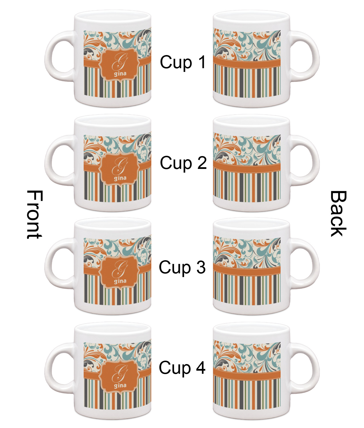 Each of our espresso mugs is a ceramic material sure to keep your drink warm. Personalize one cup for yourself, or order a set of 4! Its the perfect little gift for any coffee lover! We carry two sizes for you to personalize - 3 oz. (approx. 3.25" x 2.325" x 2.625") or 6 oz. (approx. 4" x 2.9" x 2.9"). Our 3 oz. mug is perfect for that single shot espresso while our 6 oz. mug can be your next favorite cappuccino cup holding two shots of espresso!