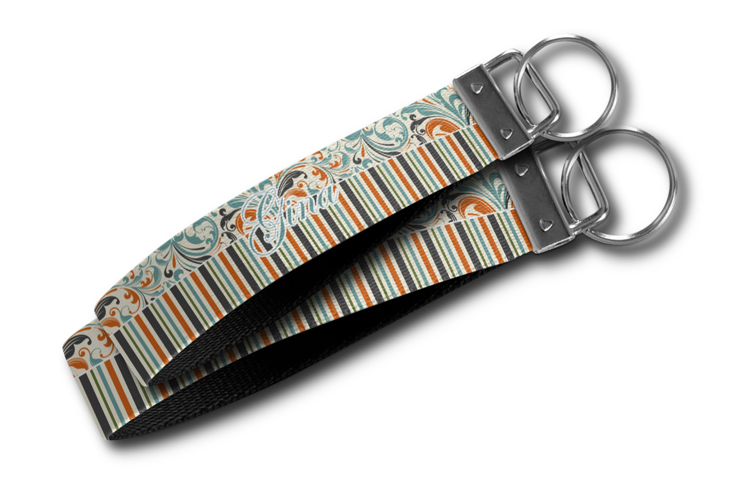 These key fob keychains are made from a polyester weave, right here in the USA. They feature a silver, metal clasp, attached to a round keyring. The piece gives the personalized wristlet a beautiful, finished look. Your customized design is printed on the outside of the keychain strap. We carry these wristlets in two sizes: small, which is 5 inches in width, and large, which is 5.5 inches in width.
