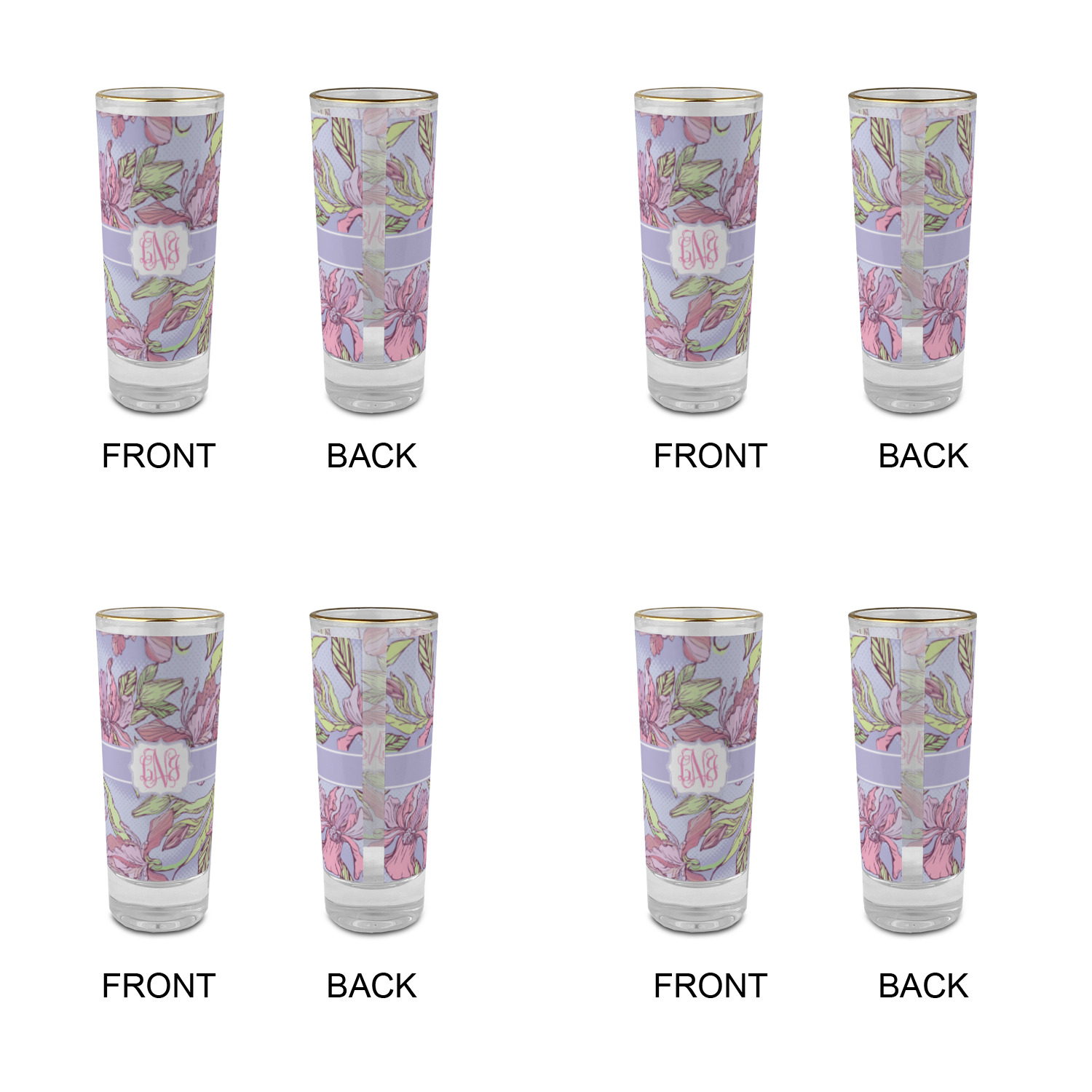 These glass shooter glasses are printed in full color with the design of your choice. These are a tall shooter 2 oz size and stand 4" tall. The print is a full wrap design to boldly display your personalization.