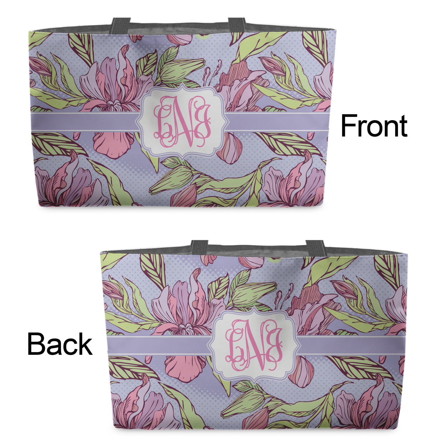 These beach totes are handmade here in the USA. Fabric is printed with your design. The tote is then sewn from the fabric pieces, lining and handles added.