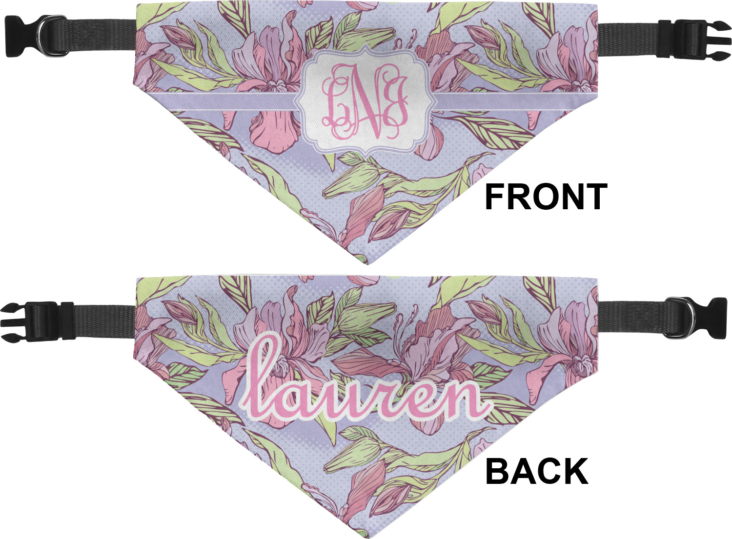 We print the front and back of these dog bandanas with your customized design. The bandana itself is made from a durable polyester, sewn together with a gap large enough to accommodate any collar. Regardless, the bandana includes a plain black, canvas collar with plastic snaps, that can easily be removed if desired. These dog bandana collars are available in four sizes: small, medium, large, and extra large. Please see our sizing chart for more information regarding the dimensions of each size.