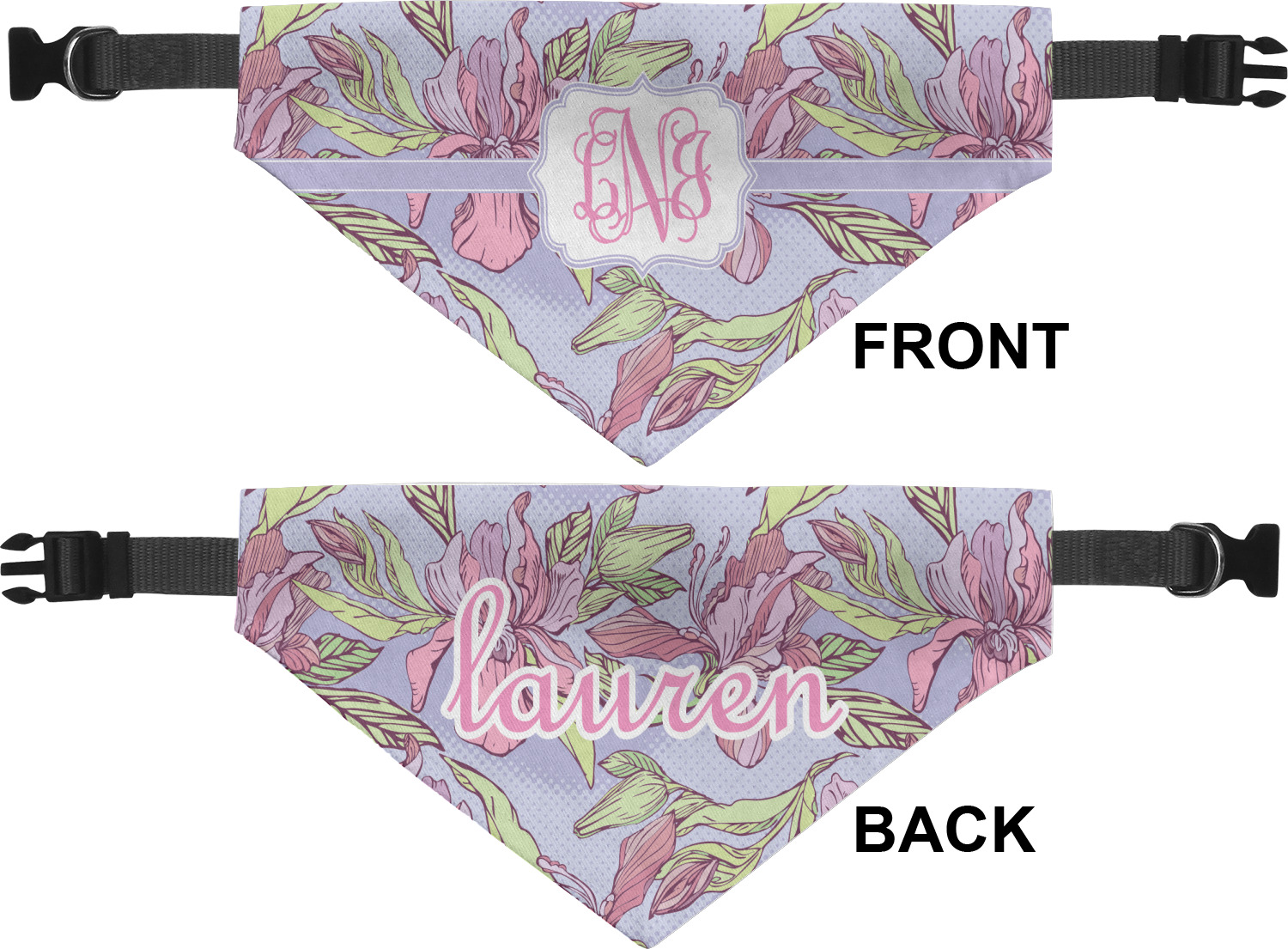 We print the front and back of these dog bandanas with your customized design. The bandana itself is made from a durable polyester, sewn together with a gap large enough to accommodate any collar. Regardless, the bandana includes a plain black, canvas collar with plastic snaps, that can easily be removed if desired. These dog bandana collars are available in four sizes: small, medium, large, and extra large. Please see our sizing chart for more information regarding the dimensions of each size.