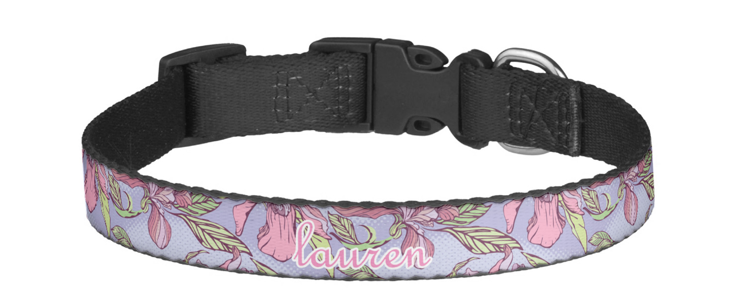 This sturdy collar, made from a durable nylon weave, will outlive your dog's episodes of excited tugging and pulling. Courtesy of its thick plastic buckle and adjuster, this collar is adjustable and accommodating of any dog. Structurally, the collar is a single piece of nylon weave that is sewn together, and features a solid metal loop where you can attach a leash or dog tag. We print and display your dog's name and pattern across the middle of the personalized dog collar.