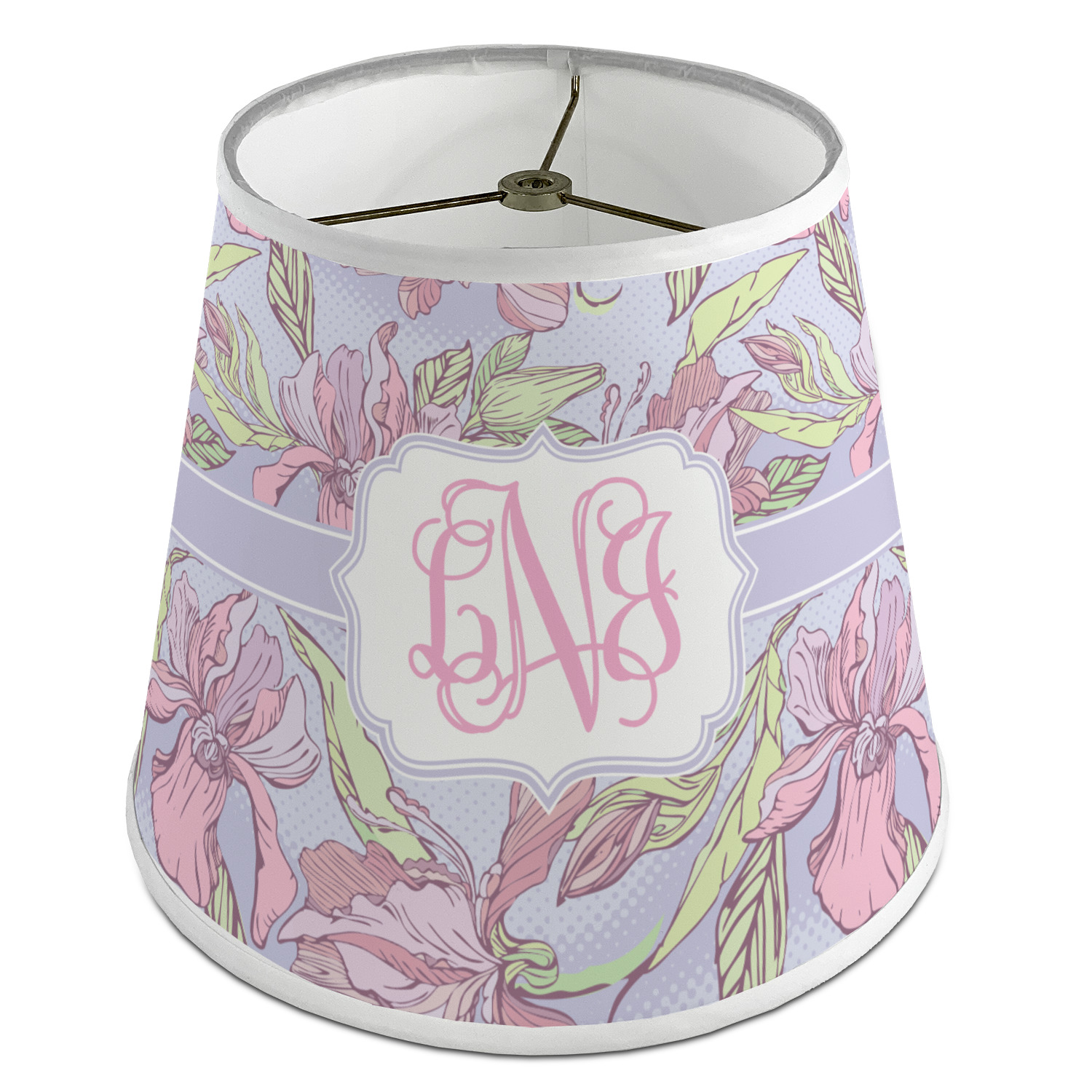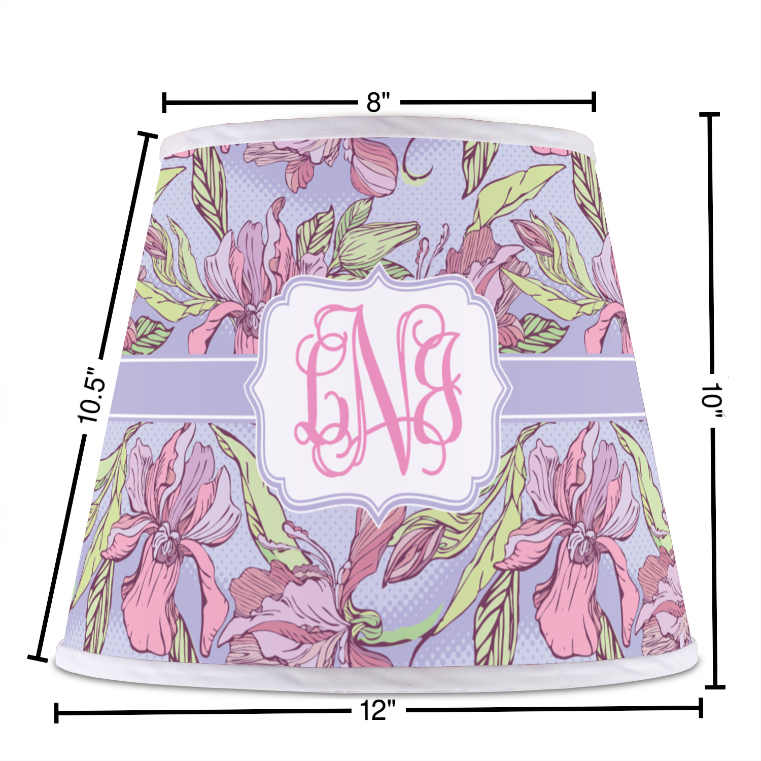 The base of this lampshade is 12 inches in diameter, and the top spans 8 inches in diameter. The total height of the lampshade is 10 inches. The angled nature of this custom lampshade concentrates the light, making it ideal for smaller spaces. This lampshade is made of matte, polyfilm, and displays your customization in its middle. The top and bottom of this colorful lamp shade are lined with a white fabric ribbon (which can be replaced with black inside the design studio) which frames your design and creates a sophisticated finish. As an UNO fitter lampshade, this unique lamp shade will fit a variety of bases.