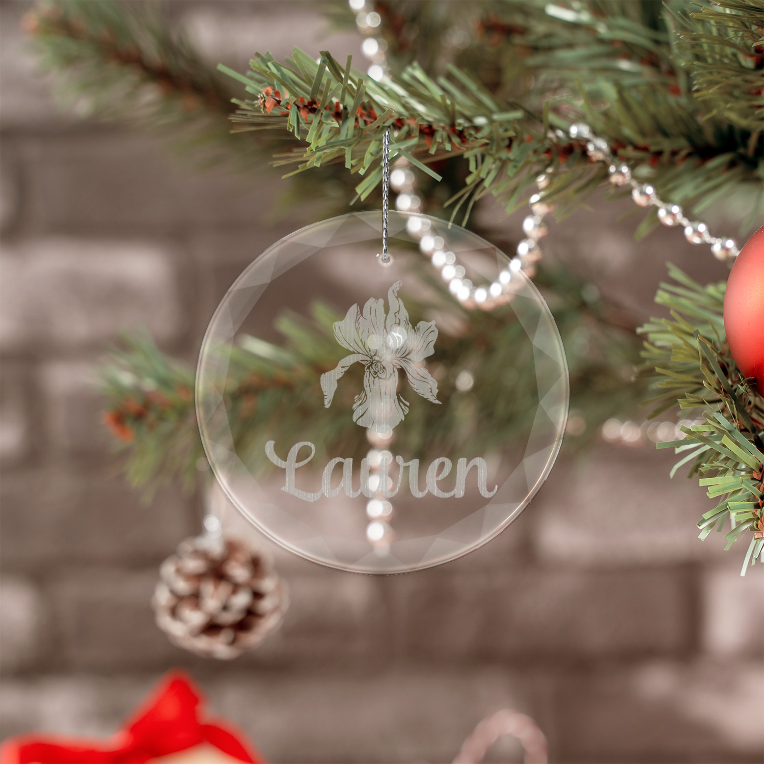We offer four different clear glass ornaments to personalize. Available in round or octagon shape. Each glass ornament is engraved with a design of your choice. Create a quote, use a photo, or logo for us to etch into your custom ornament. We pair each ornament with a silver string for you to hang on your Christmas tree!