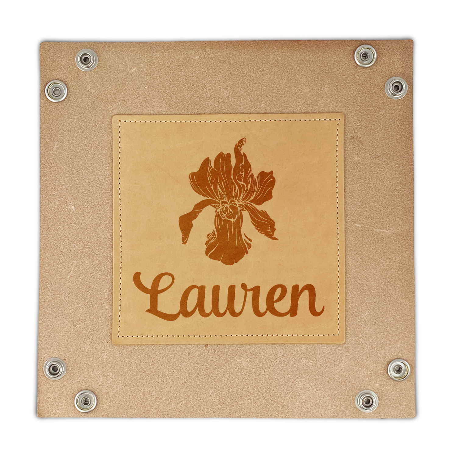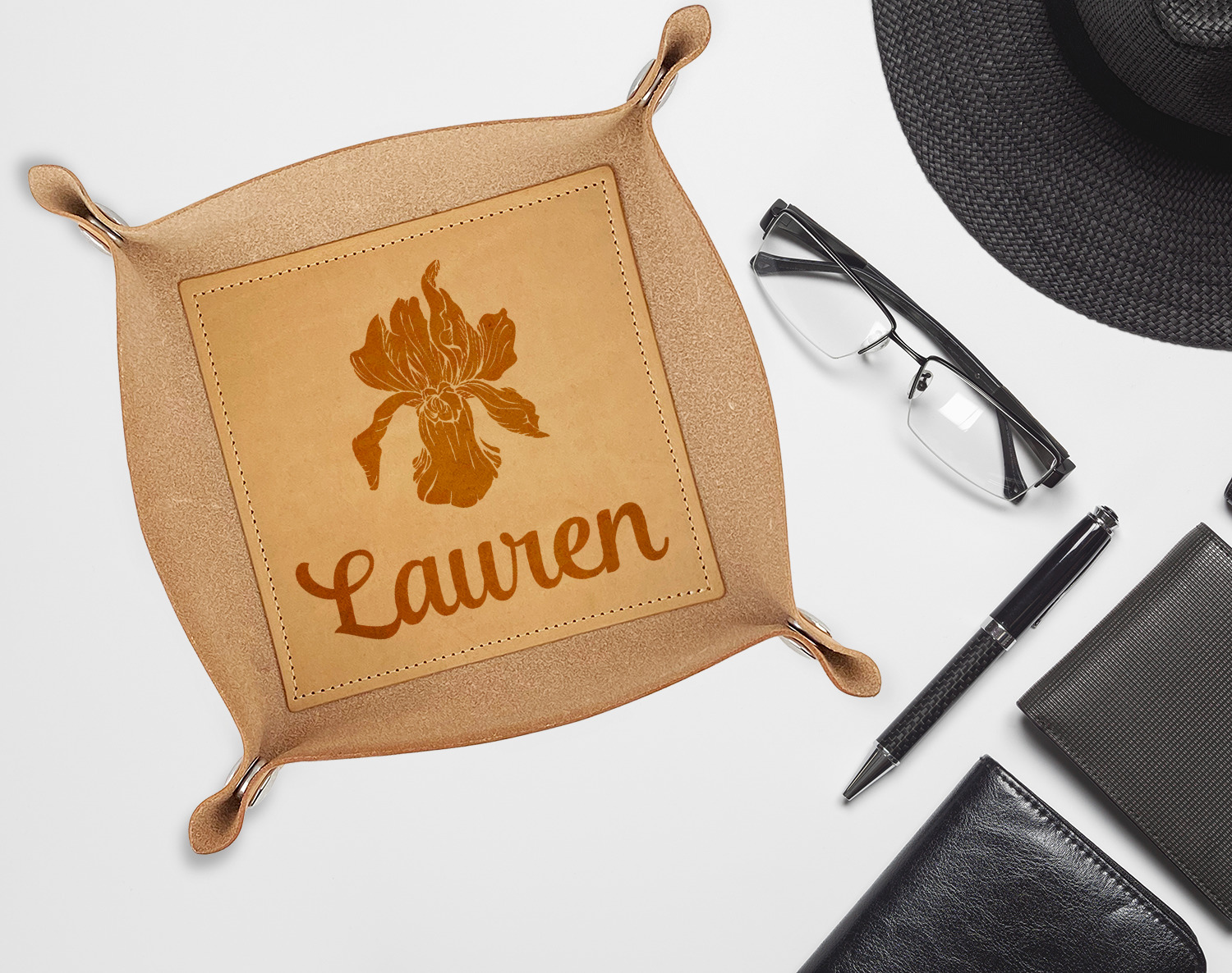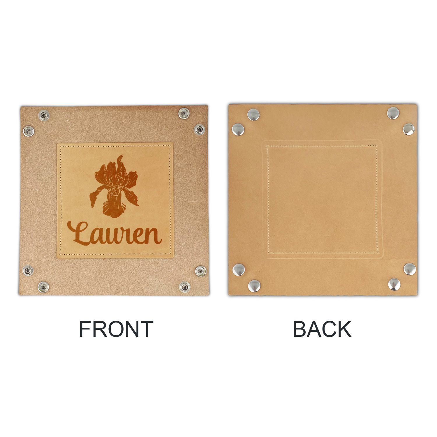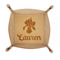 Available in one size (approximately 5.5" x 5.5" base), the natural veg, hermann oak finished genuine leather is made to hold up to heavy use over time. When closed it is approximately 1.5" deep to hold all of your necessities. Personalize it with laser engraving to add that personal touch. Folds flat for storage and the corners snap together to make a great tray.