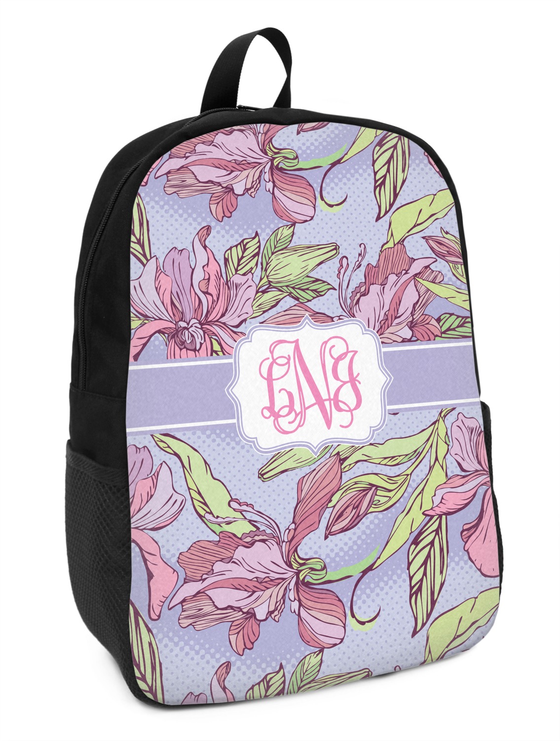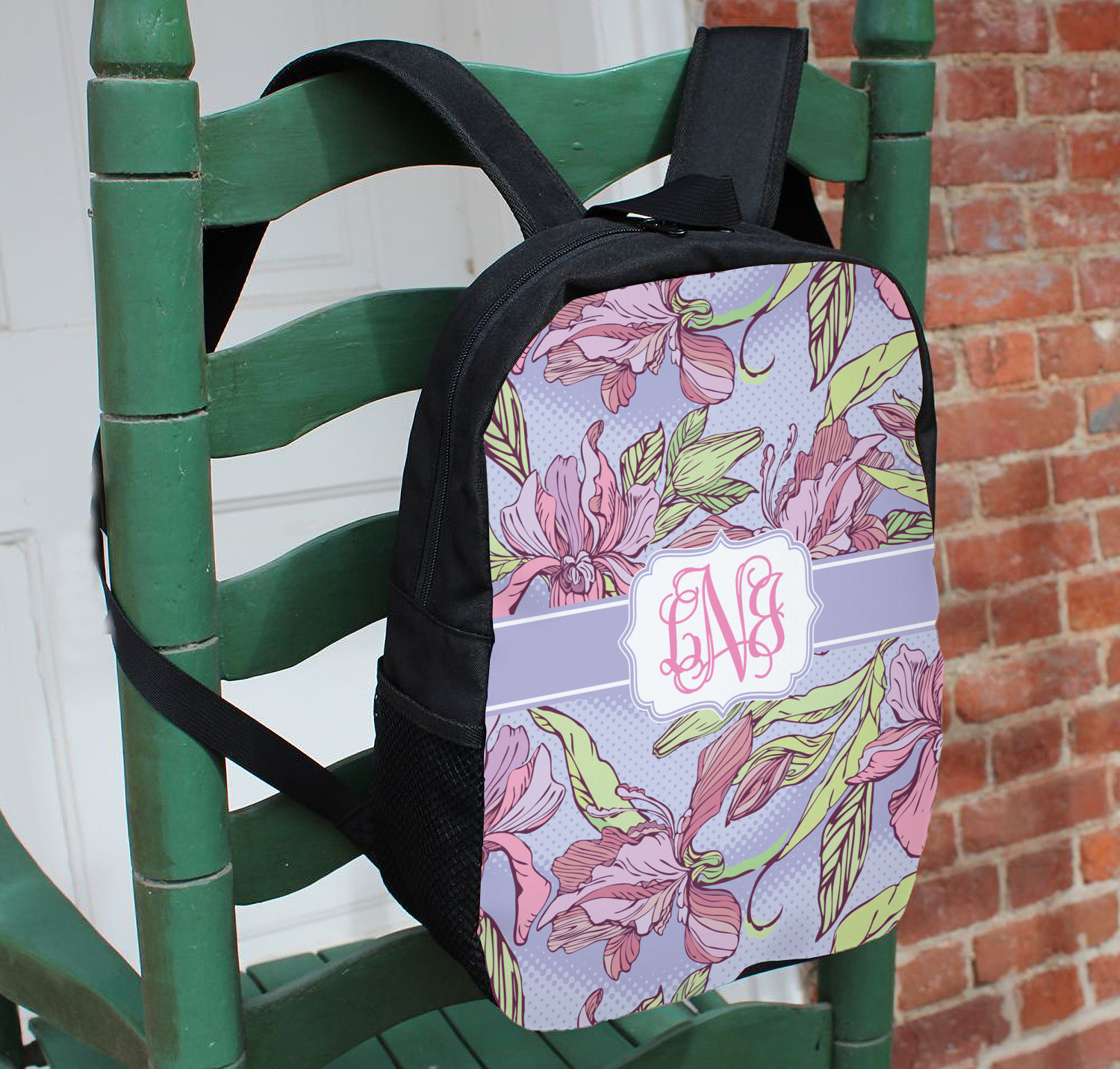 These small backpacks are made of a durable black canvas material with your personalization right on the front. The two shoulder straps are padded and easily adjustable. The bag itself measures at about 11" W x 15" H x 5" D. It's the perfect size for elementary aged kids or adults who want a smaller backpack. On the top of the bag you will find a handle to hang or carry your backpack by as well as a large zipper closure to keep all of your belongings safe inside. On each side of your backpack is a mesh pocket for a small item or water bottle. Inside your backpack you will find a spacious area with a small zipper pocket and a padded laptop slot that will fit up to a 13" laptop (13" being very snug). This is the perfect bag for any student that needs a couple books and their laptop with them at all times. It also works great as a carry on for traveling!