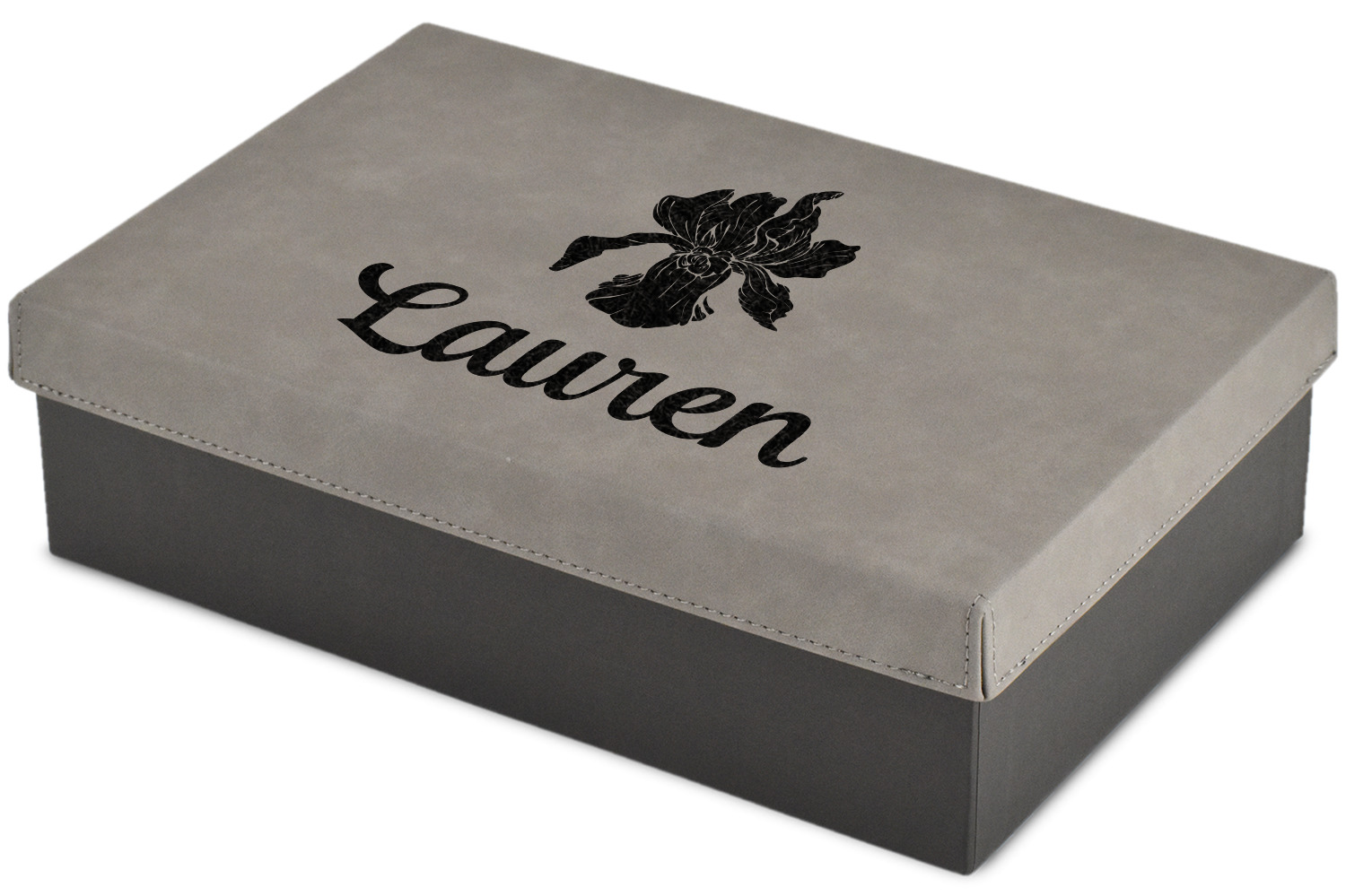 These gift boxes are available in 3 different sizes to accommodate various sized gifts. Available in gray as a neutral color for any occasion as well as to showcase your design boldly. Engraved with a laser this high quality paper board and faux leather gift box is unique and makes any gift stand out.