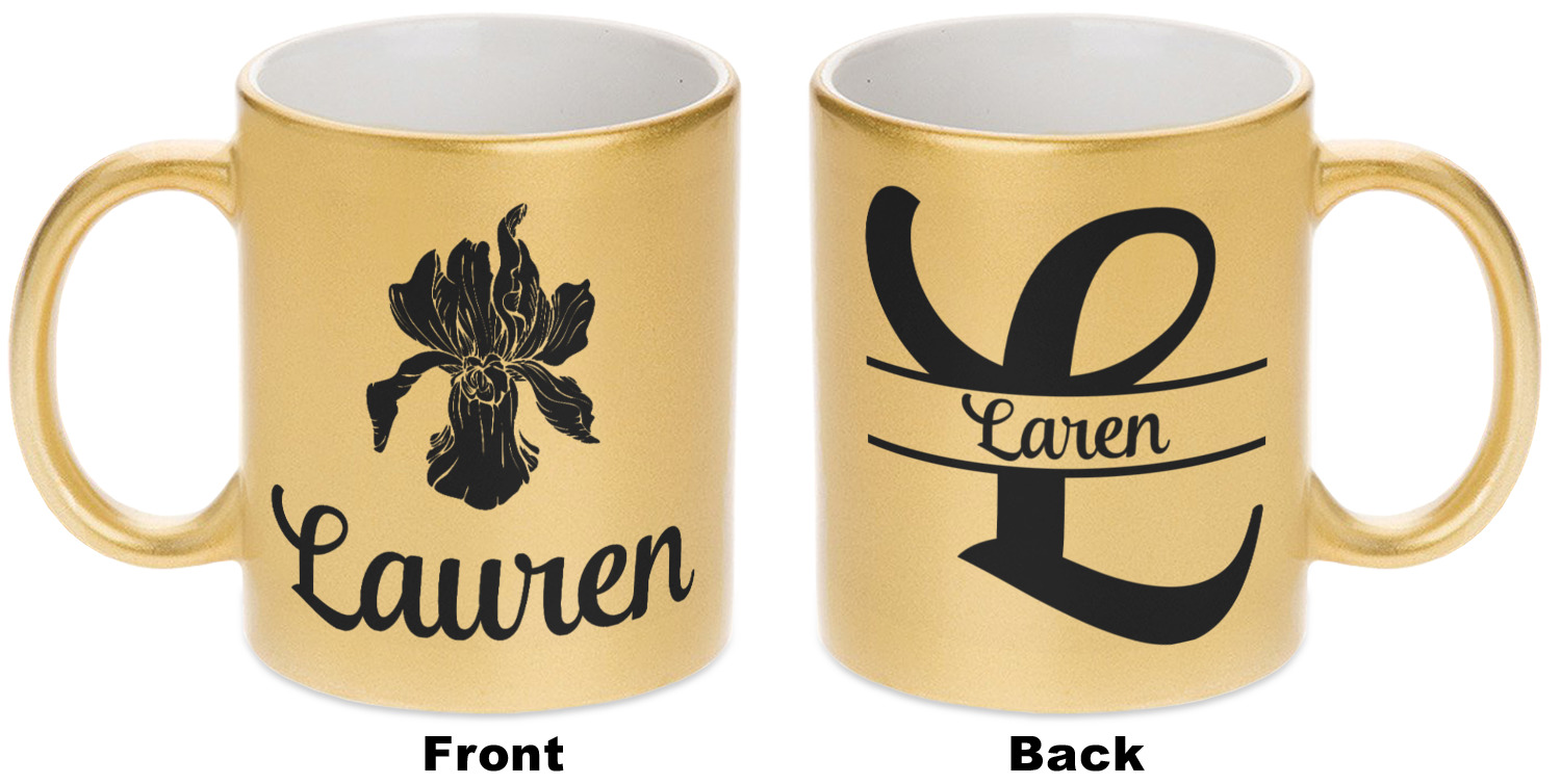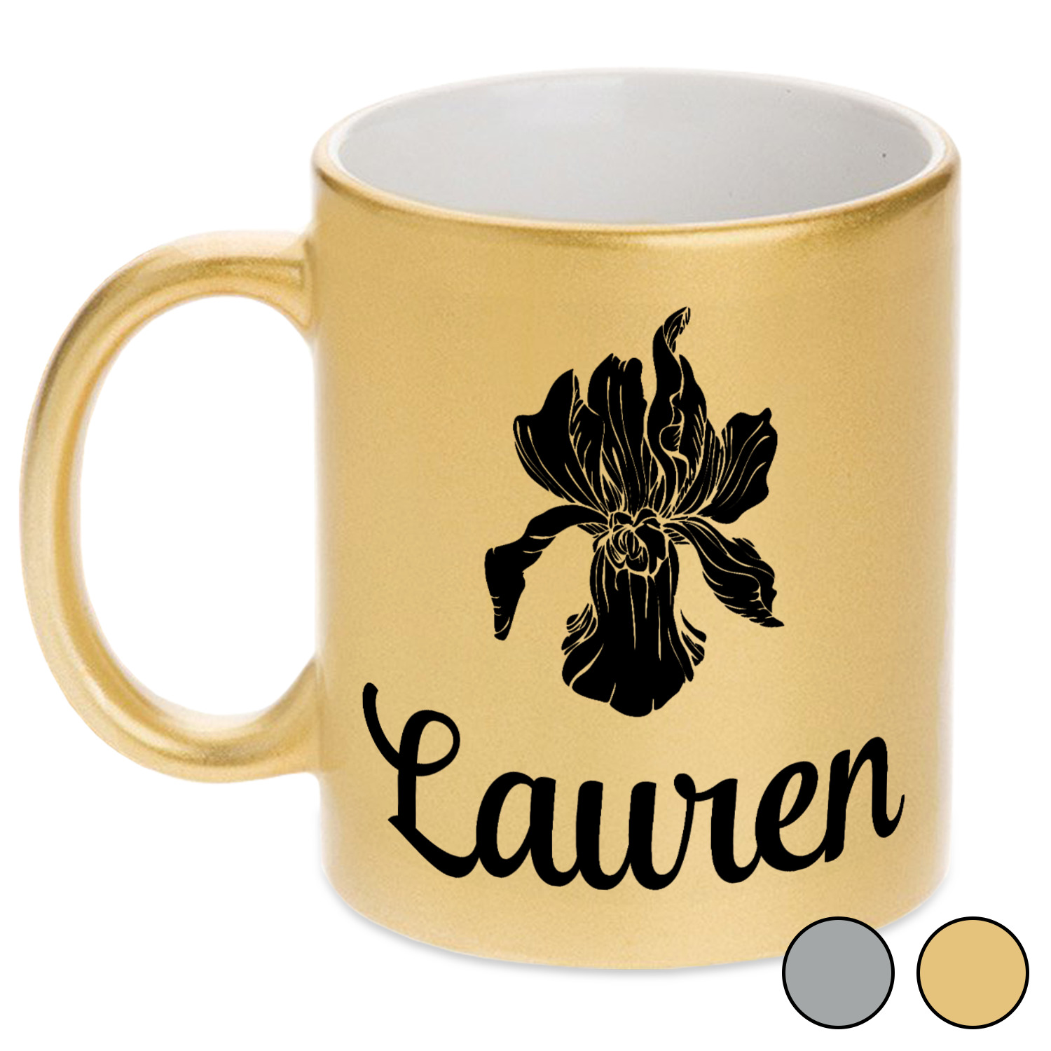 Our custom mugs are ceramic, which is great for keeping your tea or coffee warm! We offer two metallic mugs to personalize - Silver or Gold. Both styles hold around 11oz and have dimensions of approximately 3.75" x 3.5" x 4.75". Both the metallic mugs come in a matte finish and have glitter detailing to add a more pristine feel to the gold and silver base colors.