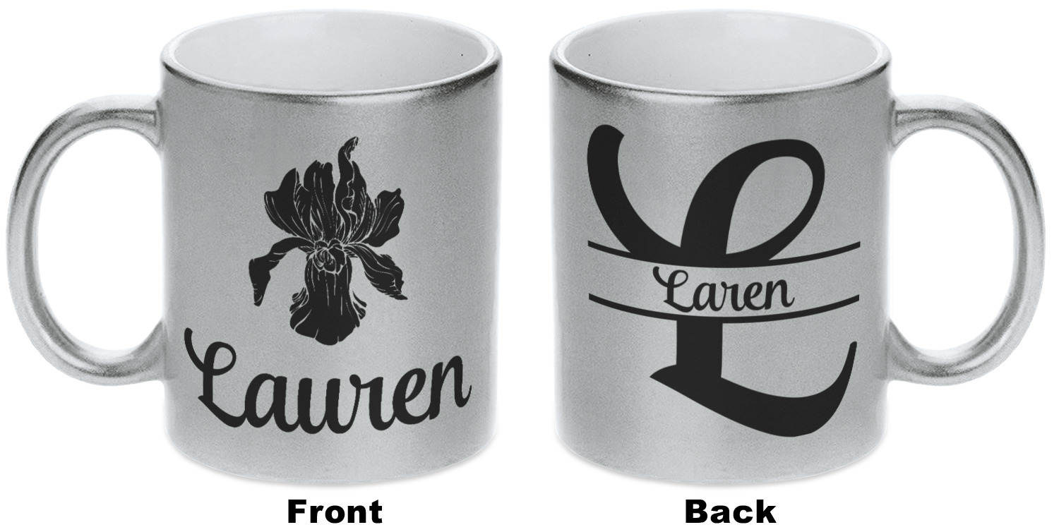Our custom mugs are ceramic, which is great for keeping your tea or coffee warm! We offer two metallic mugs to personalize - Silver or Gold. Both styles hold around 11oz and have dimensions of approximately 3.75" x 3.5" x 4.75". Both the metallic mugs come in a matte finish and have glitter detailing to add a more pristine feel to the gold and silver base colors.