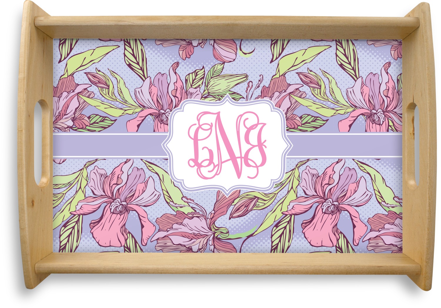 This serving tray with handles features square edges and two rounded sides, creating a very modern look. Each side is fabricated from a beautifully cut, natural wood. The bottom of the interior of the tray displays your customized design in bright, vibrant color. The tray is sold in both a black color and a natural wood look. Each variation of the wood serving tray has two sizes: Small, which is 14" x 10" x 2.25", and Large, which is 19.5" x 13.5" x 2.75".
