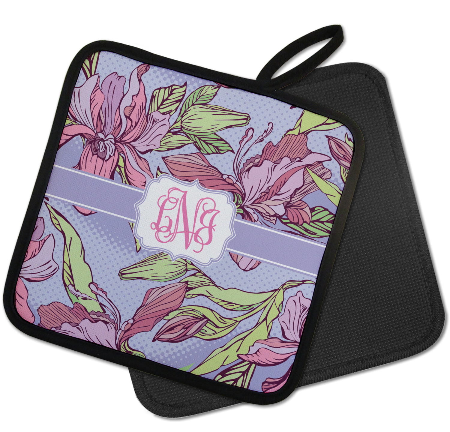 Our personalized pot holders feature a neoprene front that displays your personalization in vibrant colors. The backing of the hot pot holder is rubberized; the textured backing allows you to have a great grip when using this custom pot holder. The two materials are joined with a sleek, black trim, and the holder also includes an attached loop for hanging and storage. The pot holder is approximately 8.75 inches by 8.75 inches and 0.25 inches tall, while the fabric loop is 2.5 inches long. You can purchase a kitchen pot holder by itself or as a set of 2. We also offer a set including one pot holder and one oven mitt.