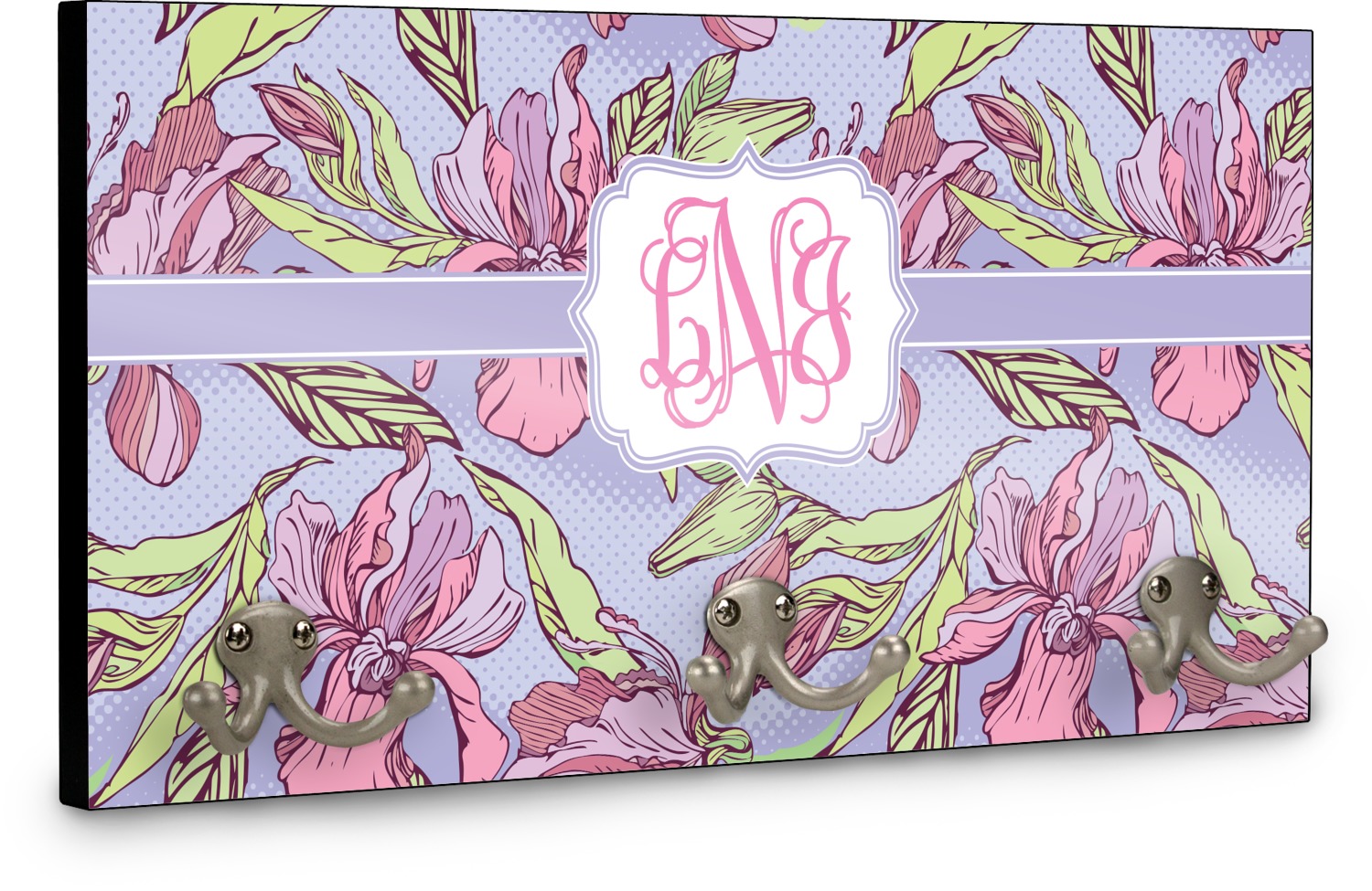 This coat rack is the perfect way to add some personality to your wall or entryway. The board is made of a strong maple that is approximately 16" x 8". The three 2-prong hooks are a sturdy metal that have three screws attaching them to the board. Your design is printed right onto the front of the board while the back and sides are a simple black.