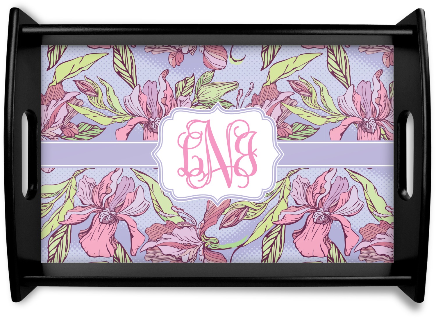 This serving tray with handles features square edges and two rounded sides, creating a very modern look. Each side is fabricated from a beautifully cut, natural wood. The bottom of the interior of the tray displays your customized design in bright, vibrant color. The tray is sold in both a black color and a natural wood look. Each variation of the wood serving tray has two sizes: Small, which is 14" x 10" x 2.25", and Large, which is 19.5" x 13.5" x 2.75".