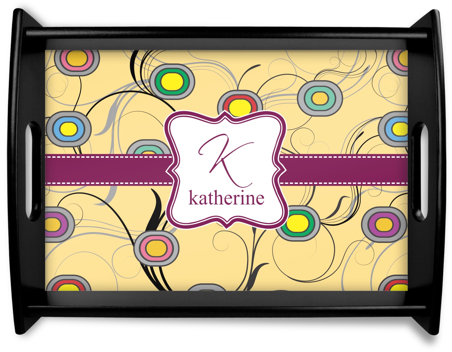 This serving tray with handles features square edges and two rounded sides, creating a very modern look. Each side is fabricated from a beautifully cut, natural wood. The bottom of the interior of the tray displays your customized design in bright, vibrant color. The tray is sold in both a black color and a natural wood look. Each variation of the wood serving tray has two sizes: Small, which is 14" x 10" x 2.25", and Large, which is 19.5" x 13.5" x 2.75".