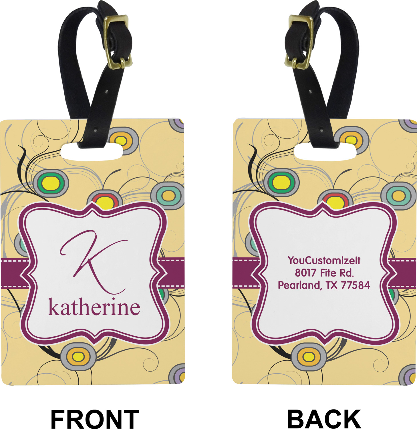 These cute luggage tags are made of a fiber-reinforced, UV-resistant plastic, making them waterproof and durable enough for both everyday use and the rugged adventures of any traveler! A leather strap with holes and a buckle is included with your purchase and can be used to attach your custom luggage tag to any suitcase, backpack, or duffel bag. You can design these travel tags as you wish; your customization will be displayed across the front, while the back will show as little or as much personal information as you want.