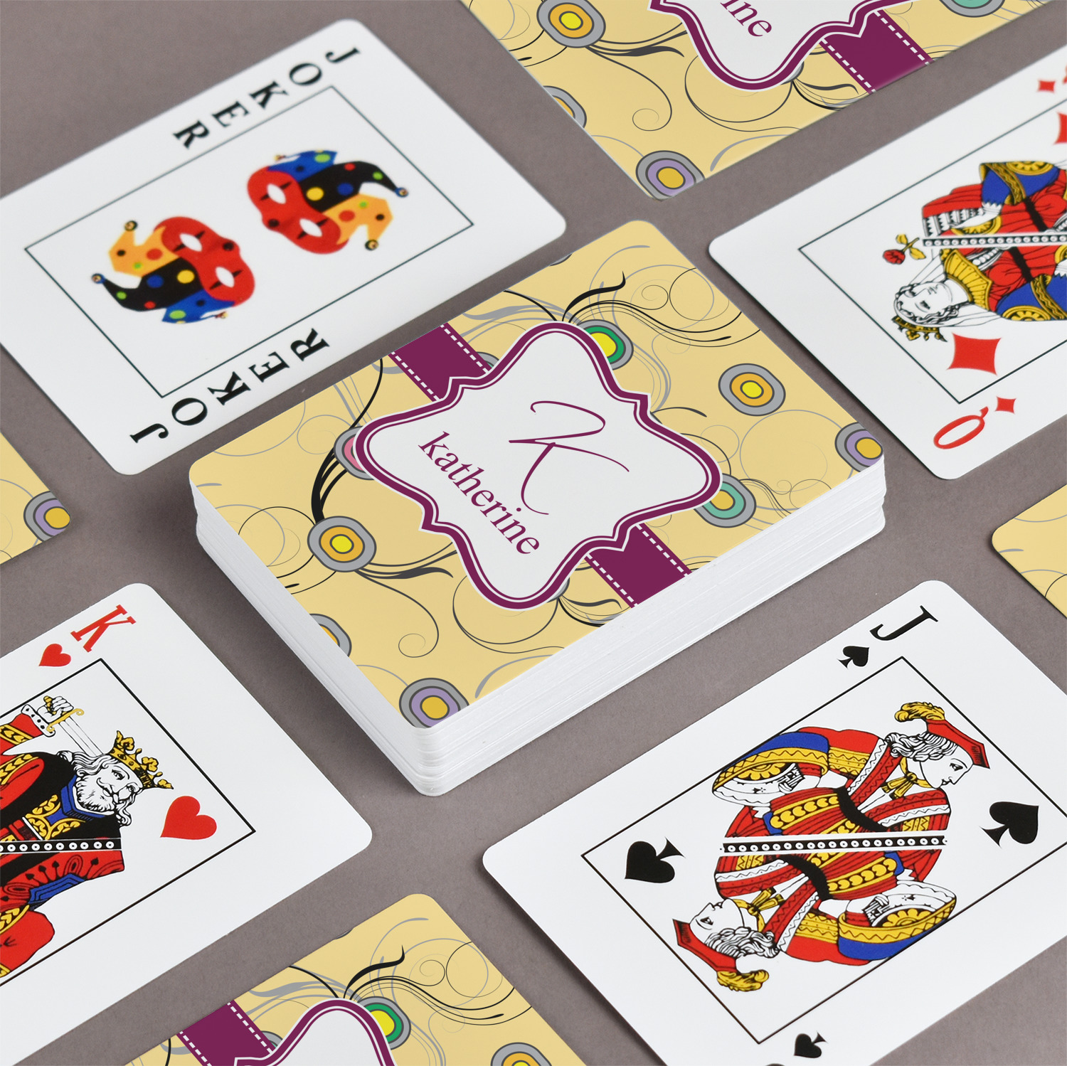 The customization / personalization is printed on the back side. The playing cards have a low gloss coating on both sides. The cards are packaged in a clear plastic box.