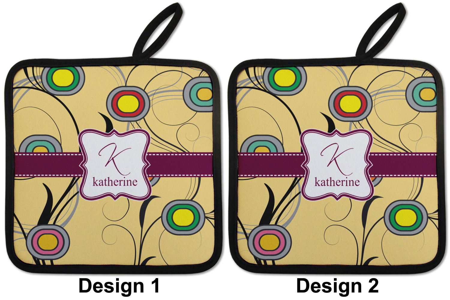 Our personalized pot holders feature a neoprene front that displays your personalization in vibrant colors. The backing of the hot pot holder is rubberized; the textured backing allows you to have a great grip when using this custom pot holder. The two materials are joined with a sleek, black trim, and the holder also includes an attached loop for hanging and storage. The pot holder is approximately 8.75 inches by 8.75 inches and 0.25 inches tall, while the fabric loop is 2.5 inches long. You can purchase a kitchen pot holder by itself or as a set of 2. We also offer a set including one pot holder and one oven mitt.