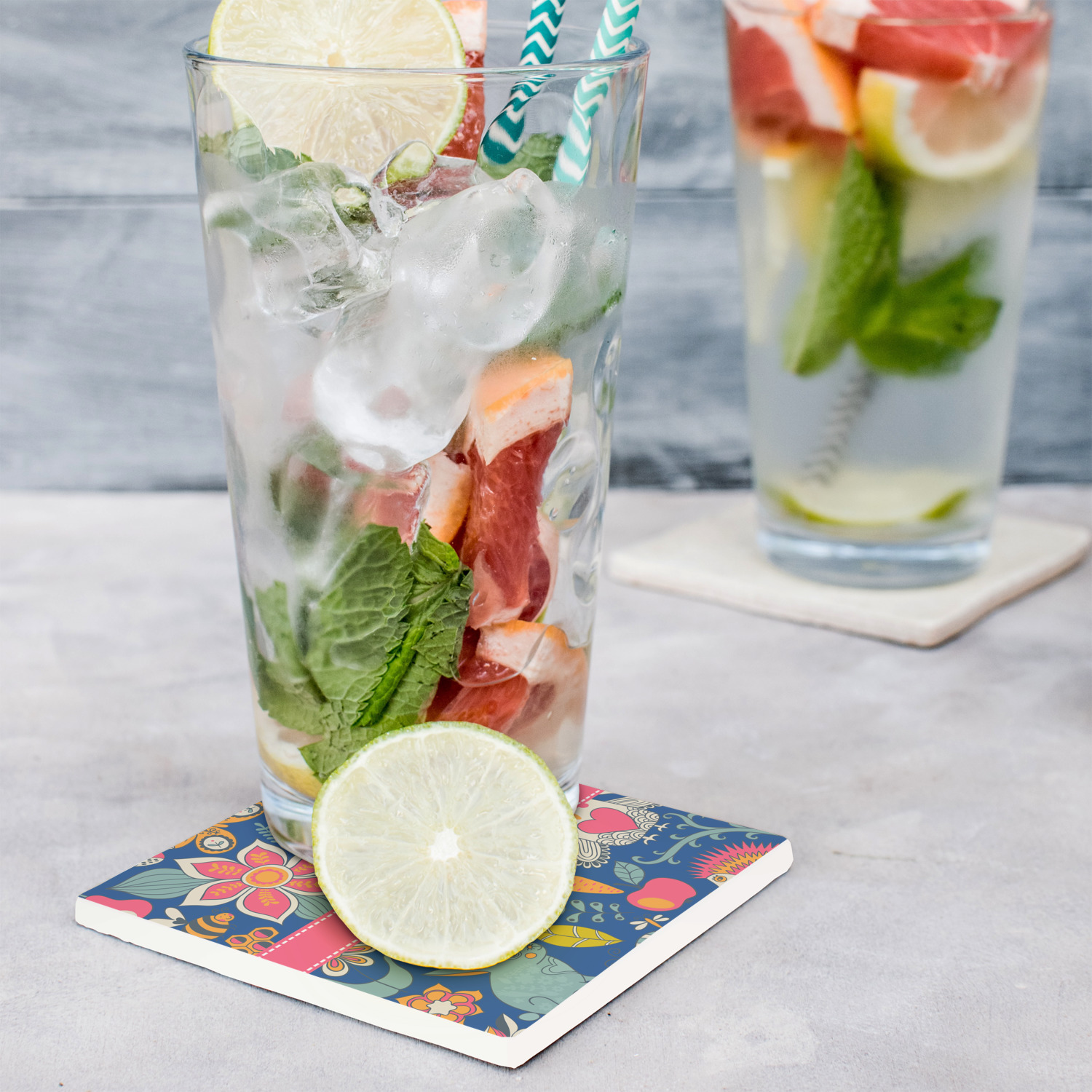 Our super absorbent stone coasters absorb the condensation into the coaster, before it has a chance to flow on to your furniture or table tops, thus preventing watermarks and blemishes.