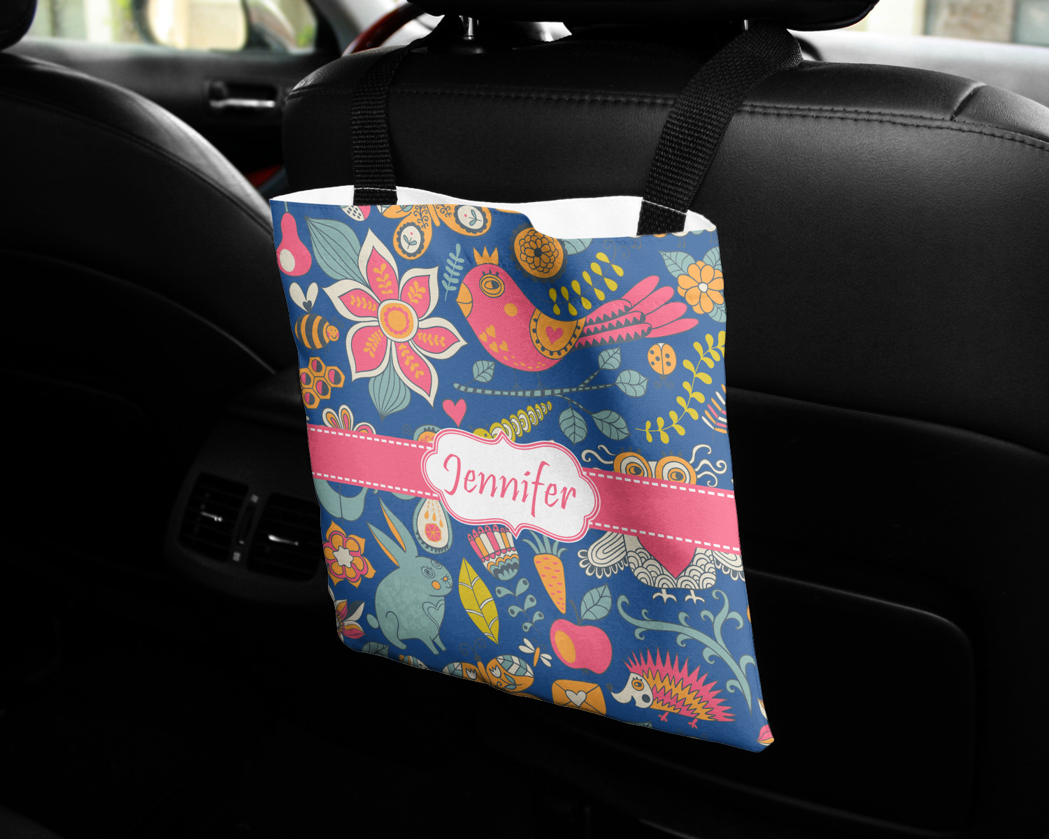 These car back seat organizers are sturdy tote-like bags, fabricated from a robust polyester, and features a single handle on the back side. The strap features an attachable velcro for easy attachment to headrests, grocery carts, car seats, and more. Simply undo the velcro, loop the strap around the headrest, reattach the velcro, and let the organizer hang from the front seat. These car organizers are the perfect means of increasing your backseat's legroom, while storing multiple items in one place for better accessibility. Each car back seat organizer measures at 10 by 10 inches, and features your personalized design printed across its front and back.