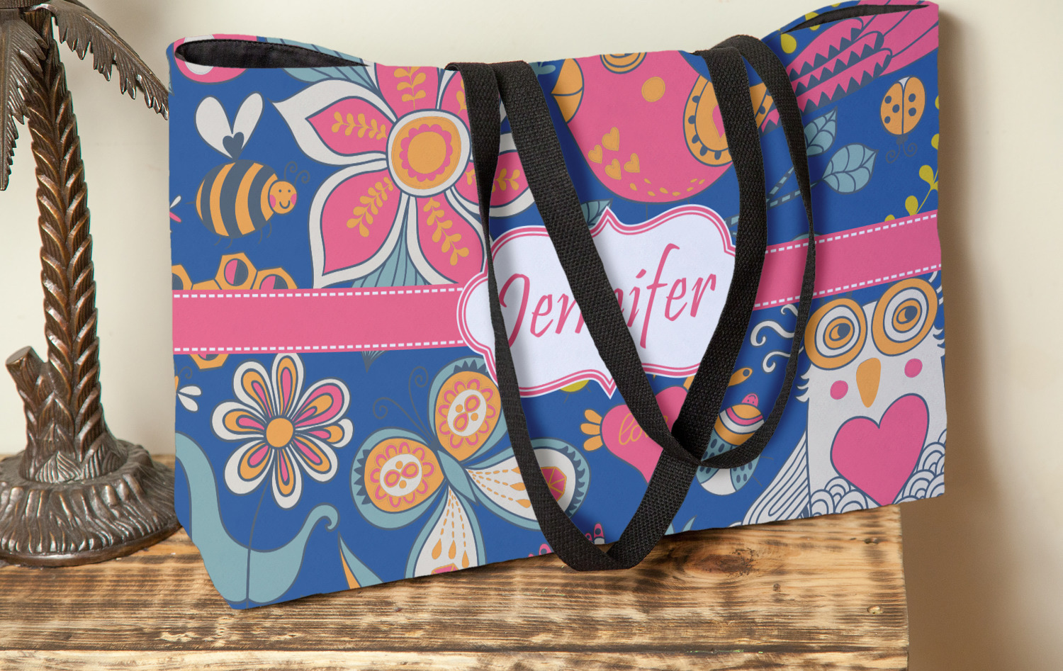These beach totes are handmade here in the USA. Fabric is printed with your design. The tote is then sewn from the fabric pieces, lining and handles added.