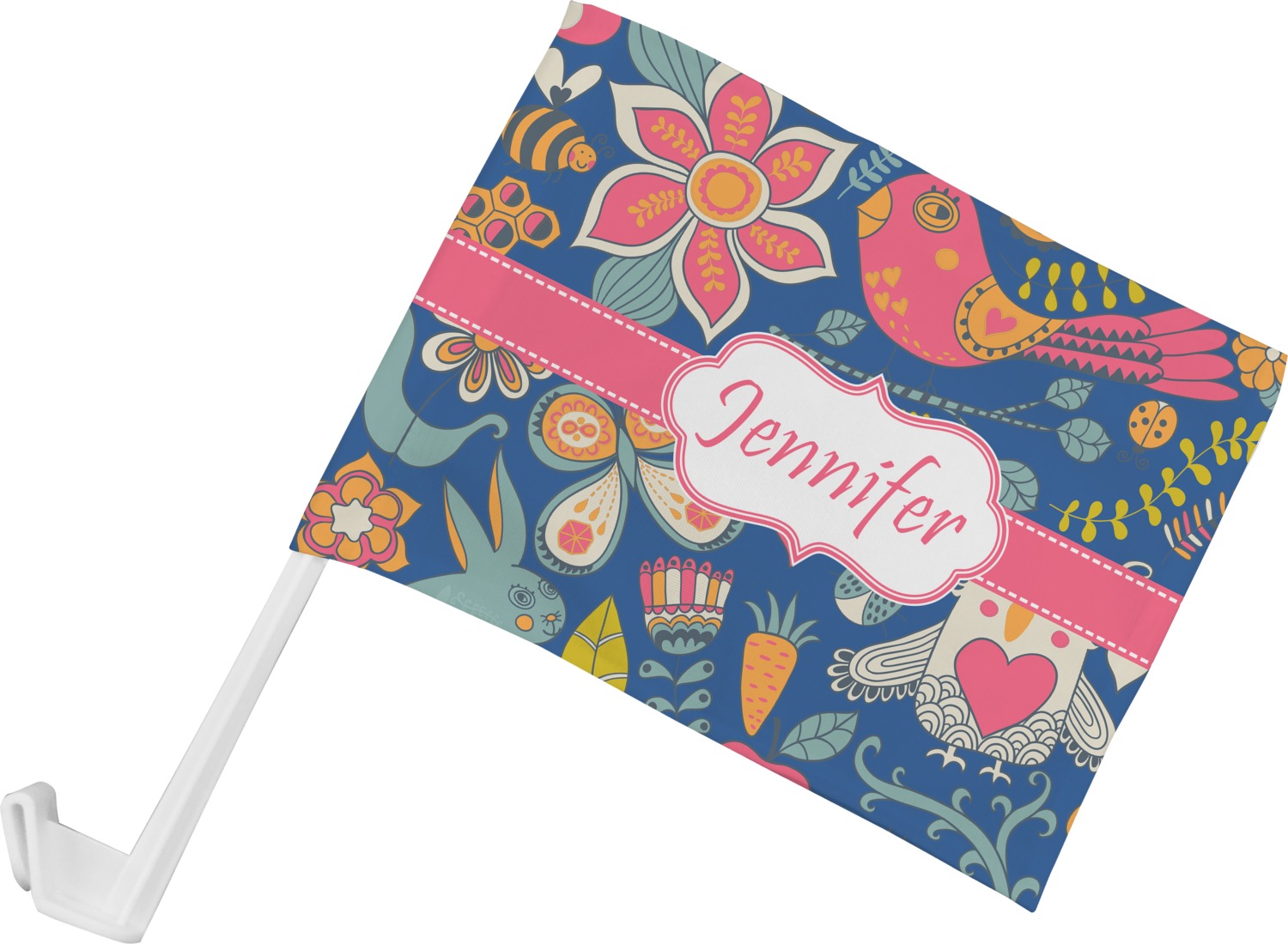 Our personalized flags are made from a durable, yet lightweight cloth that will proudly bear your logo or design of choice, while withstanding the outside elements. We have two size options - 8" x 11" and 11" x 15". Both come with a flag pole which includes a clip that secures the pole to the side window, whether it is rolled up or down. The flags are printed on both sides to display your design from all directions.