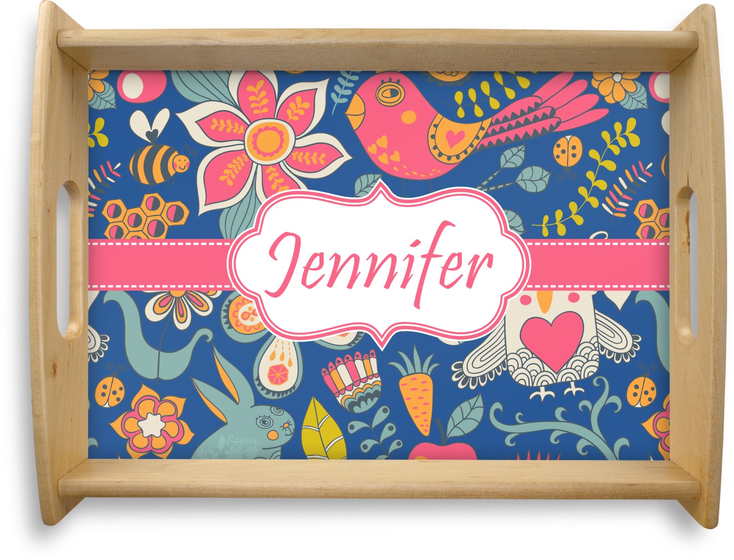 This serving tray with handles features square edges and two rounded sides, creating a very modern look. Each side is fabricated from a beautifully cut, natural wood. The bottom of the interior of the tray displays your customized design in bright, vibrant color. The tray is sold in both a black color and a natural wood look. Each variation of the wood serving tray has two sizes: Small, which is 14" x 10" x 2.25", and Large, which is 19.5" x 13.5" x 2.75".