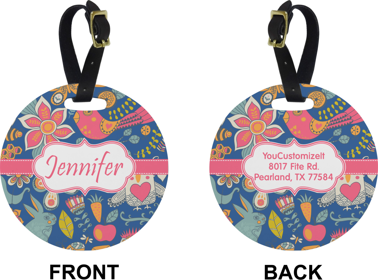 These personalized bag tags are sold in a variety of shapes, so that you may find the product that meets your vision exactly. We sell a round luggage tag, which measures at approximately 4" x 4". Our square luggage tag is about 3.5" x 3.5", while our rectangular version is 2.75" x 4 ".